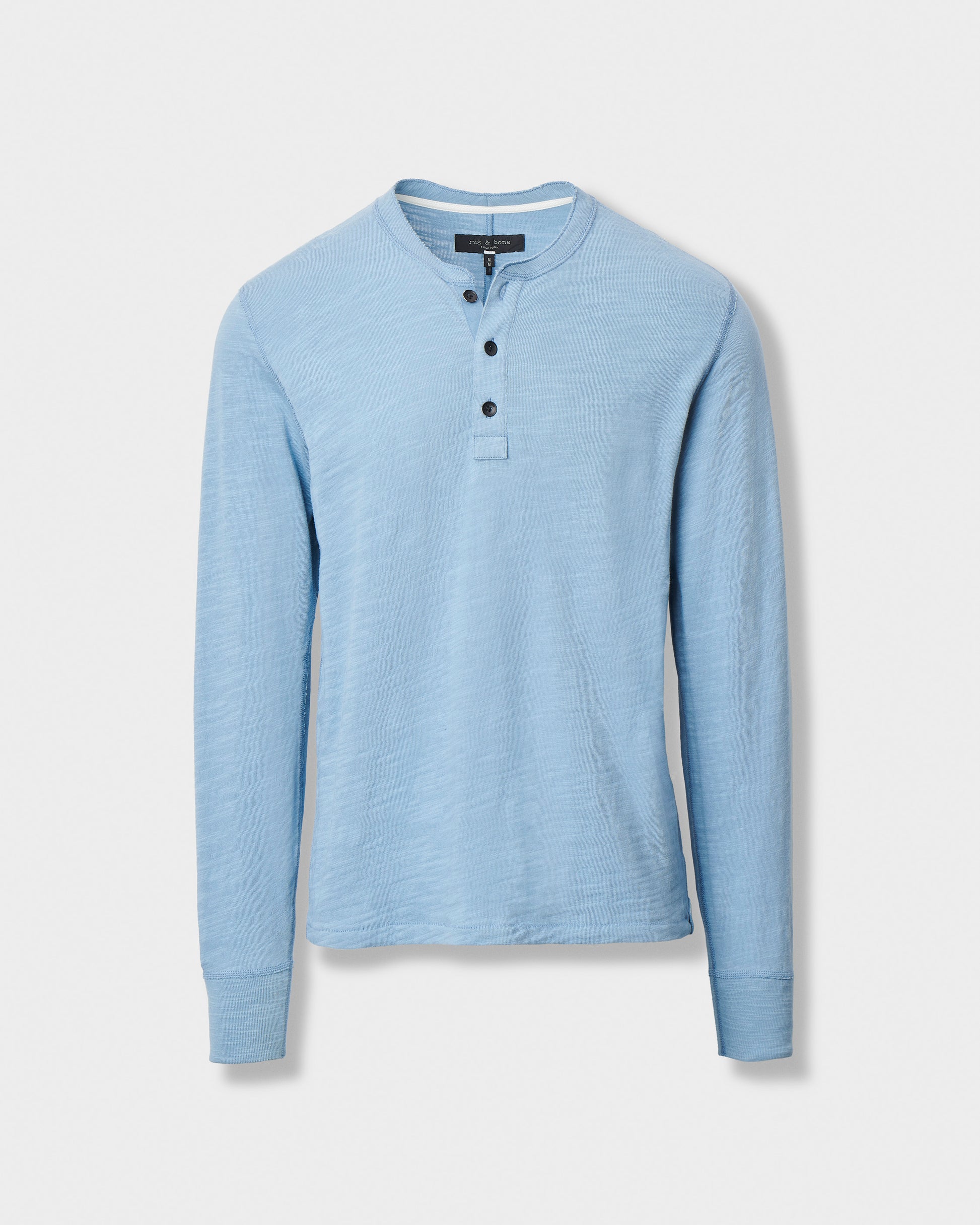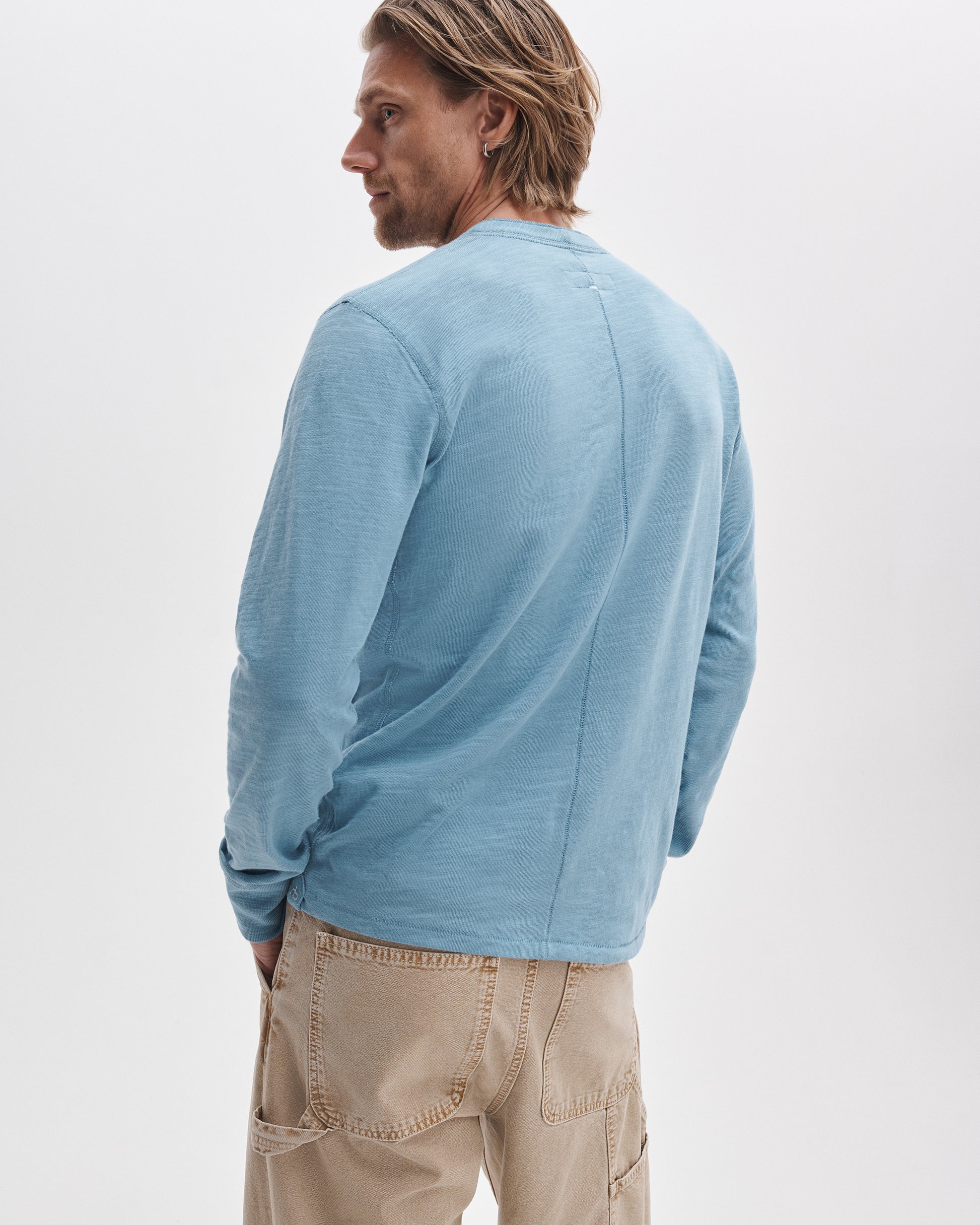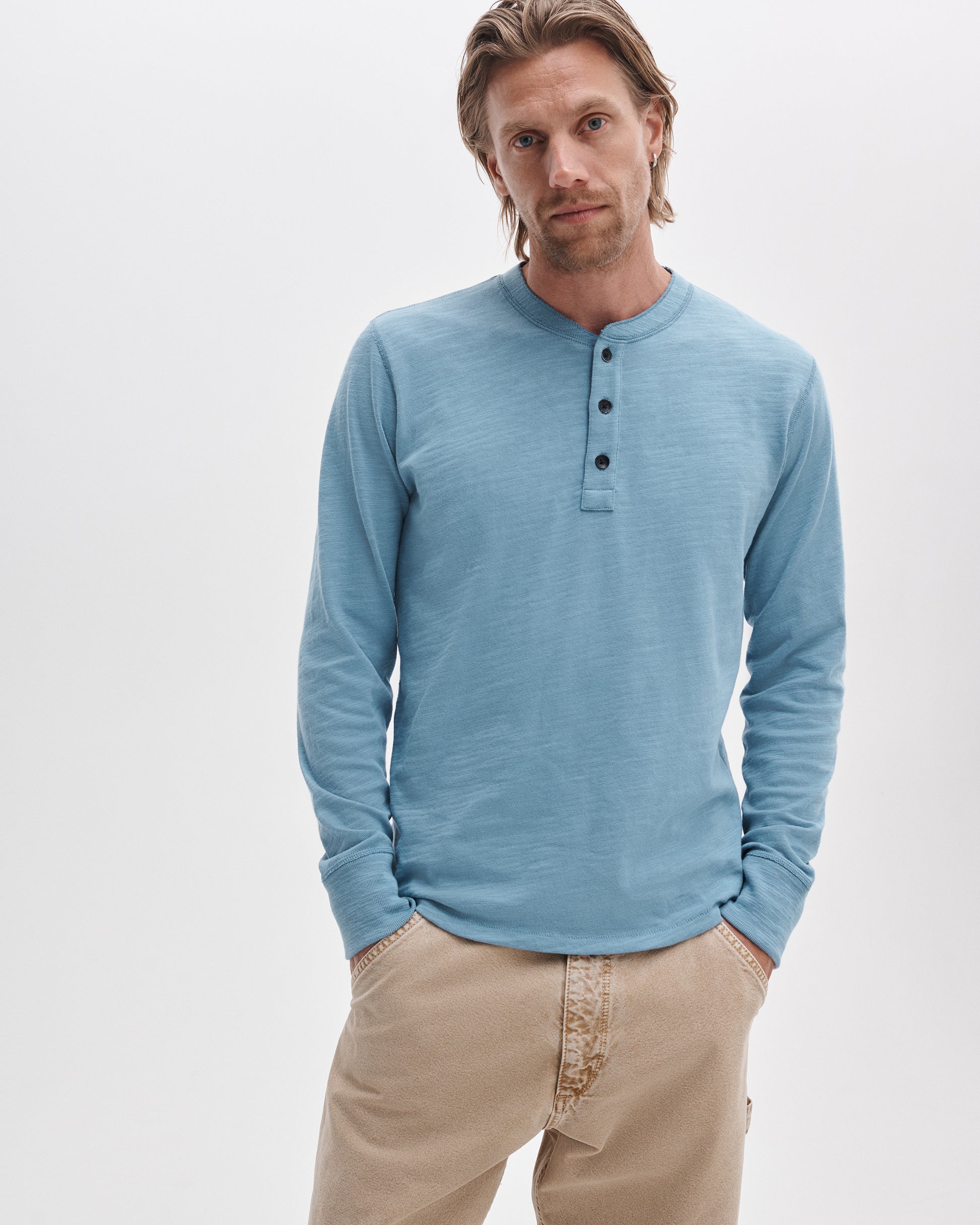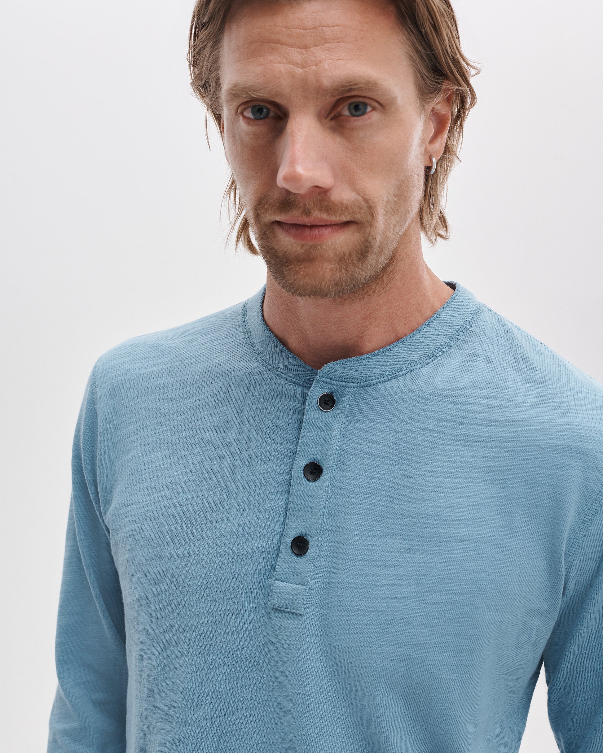 ペルー産のスラブコットンジャージーで作られた定番のヘンリーネックのロングスリーブシャツ。