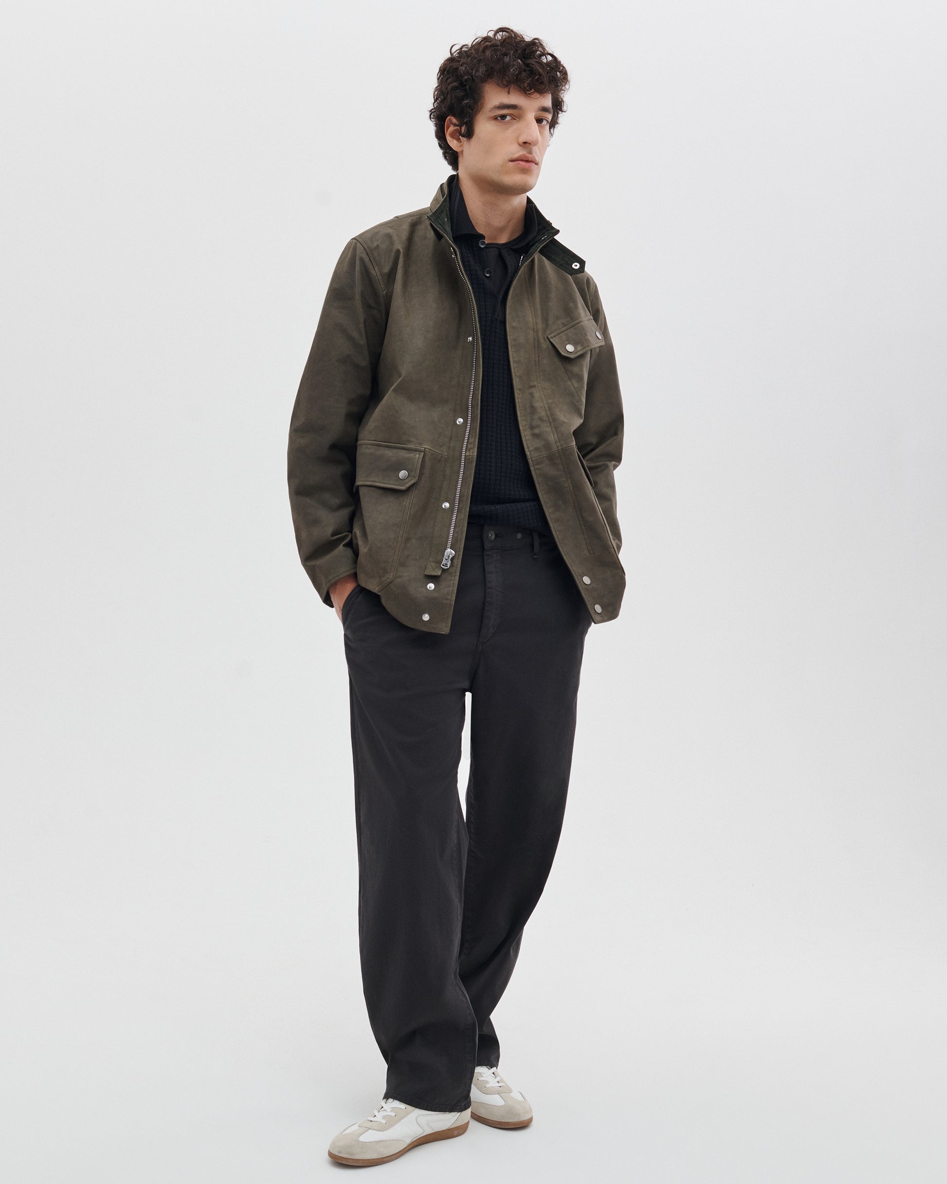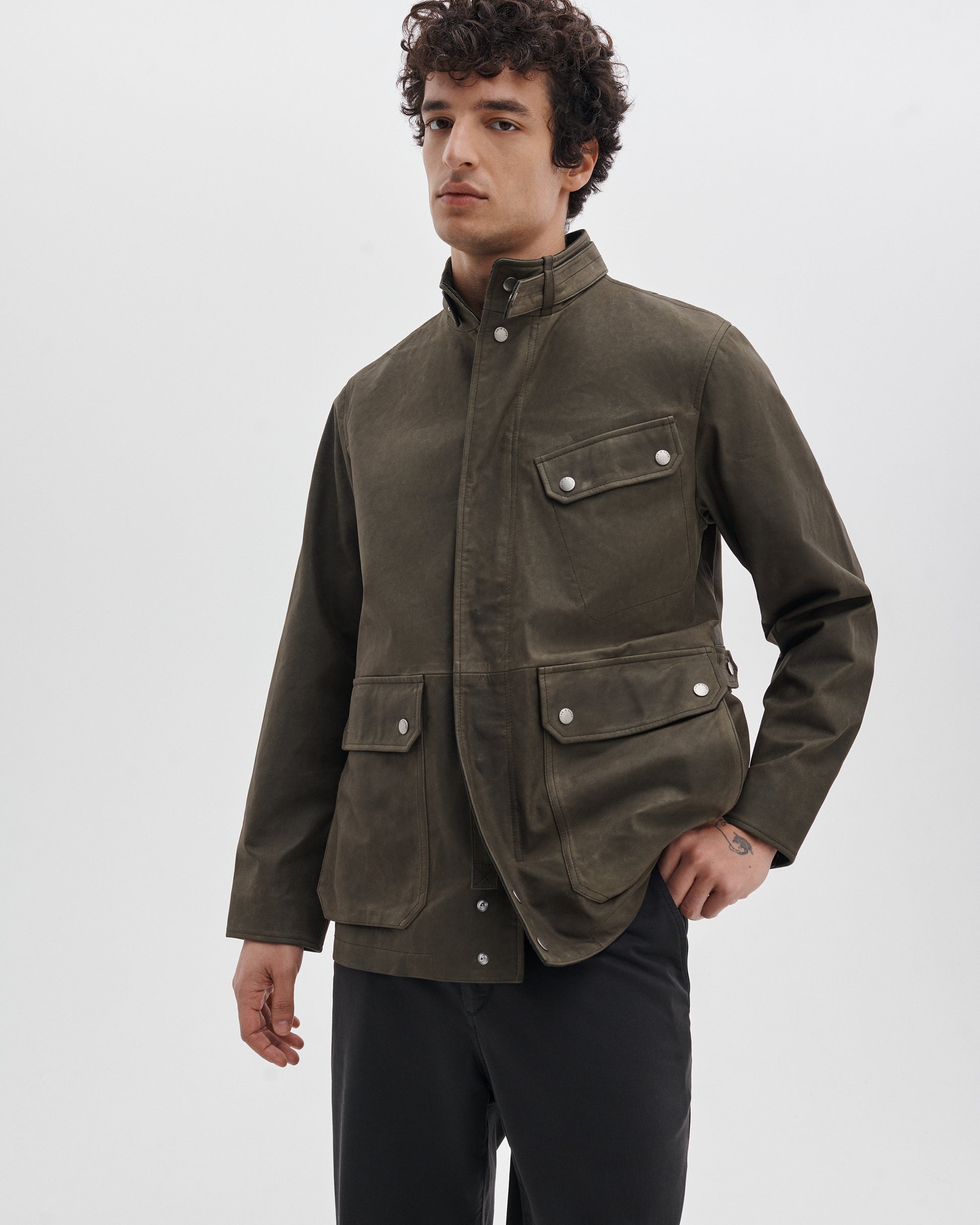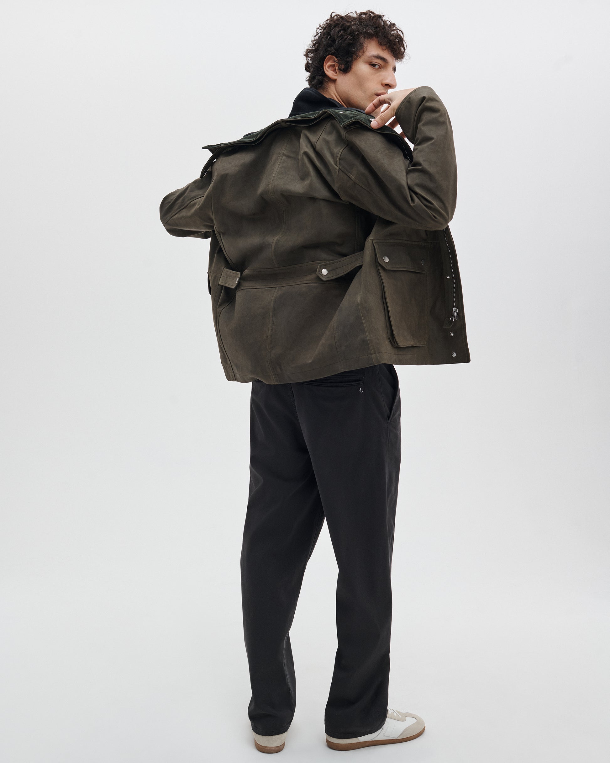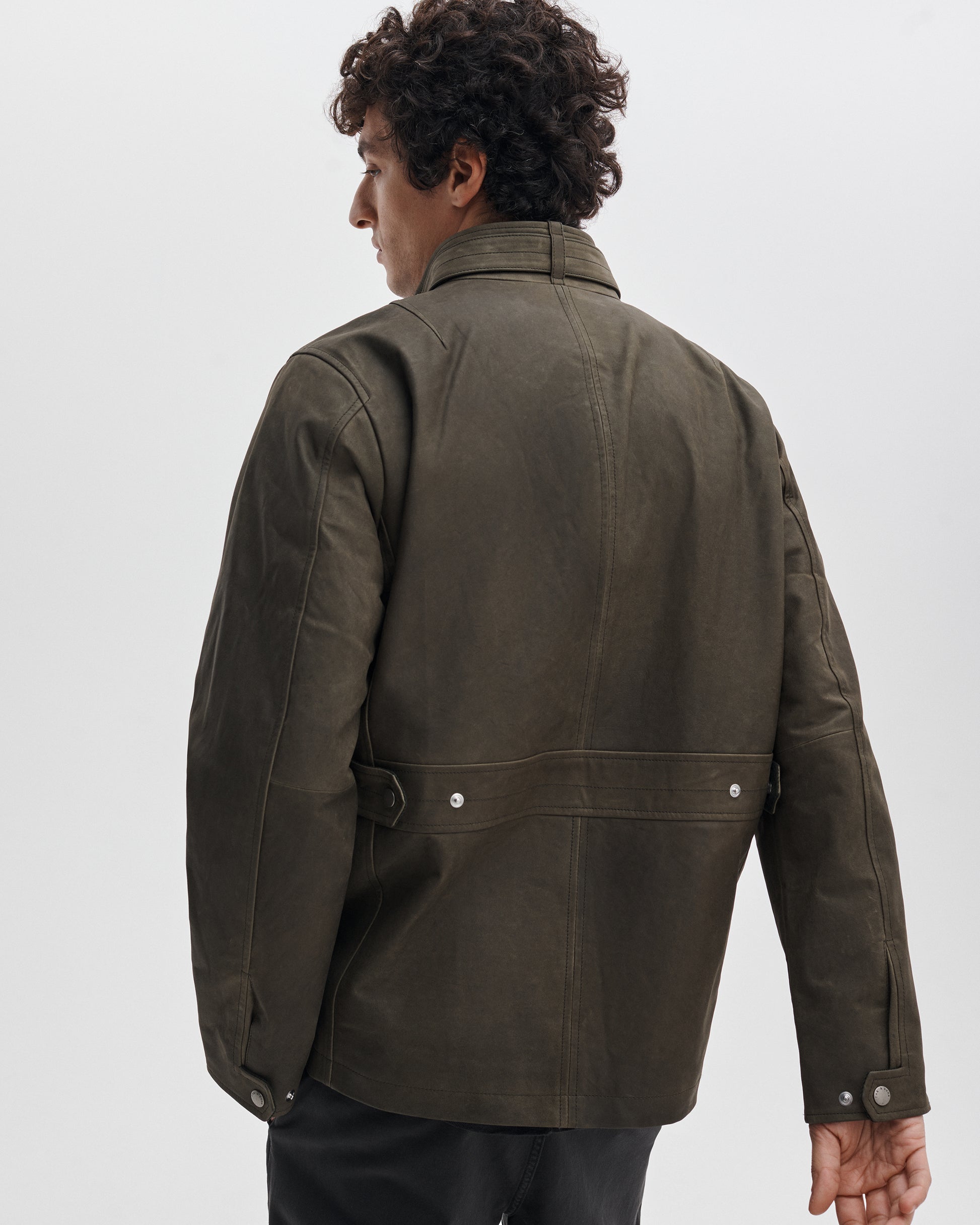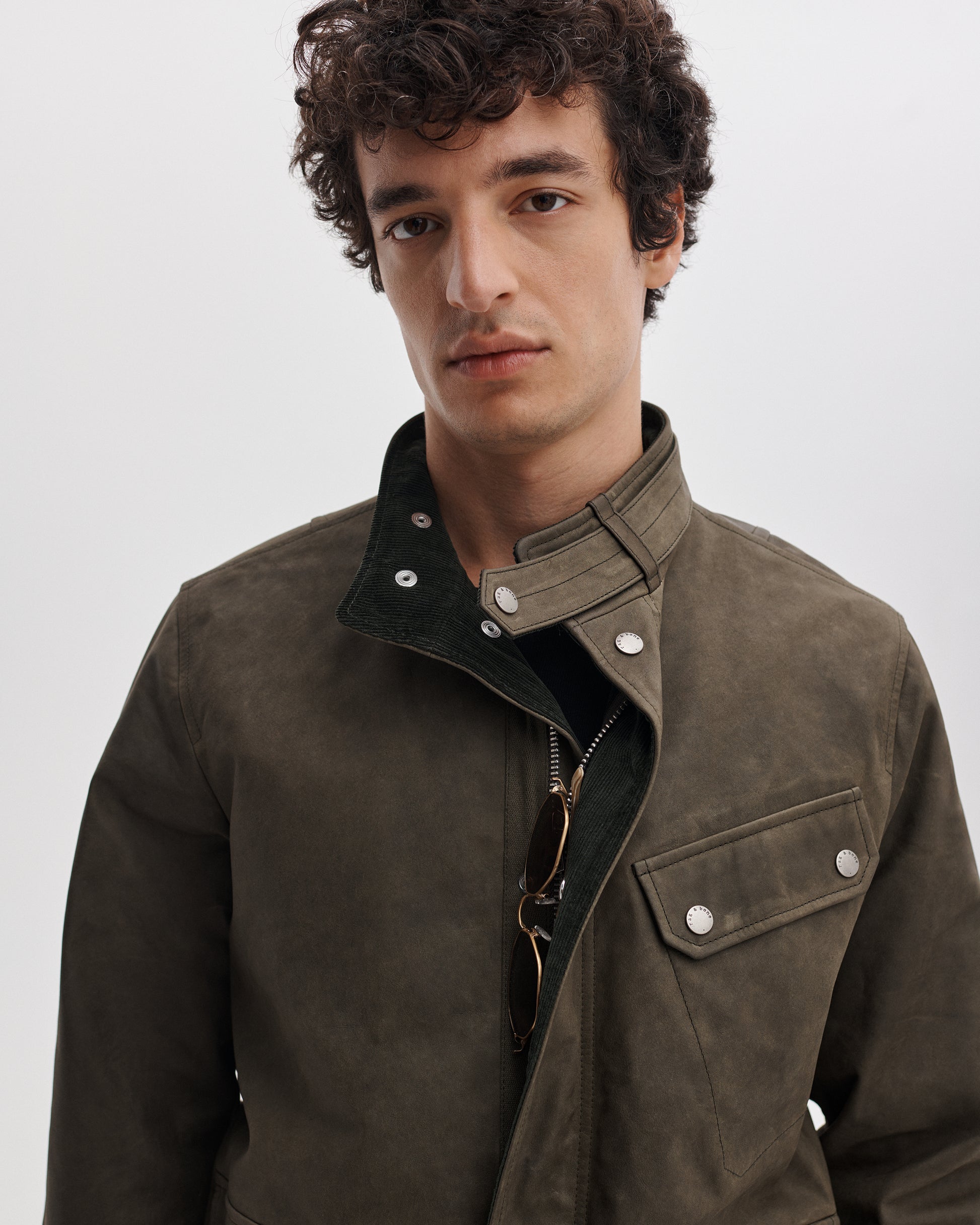 オイルコーティングされたスエード生地を使用したミドル丈ジャケットは、イギリスの伝統的なバイカースタイルを取り入れています。ずっしりとした生地と同色のベルトストラップがエッジの効いた一着です。きれいめなトラウザーやウォッシュのかかったデニムなど、あらゆるアイテムと合わせることができます。