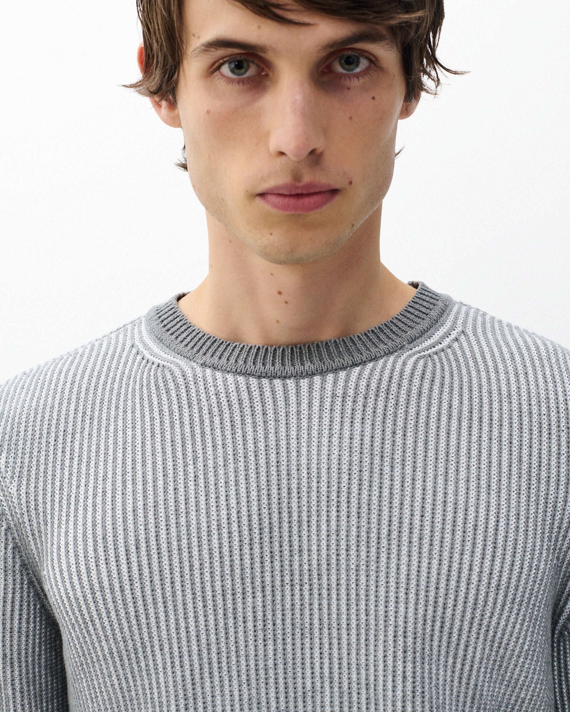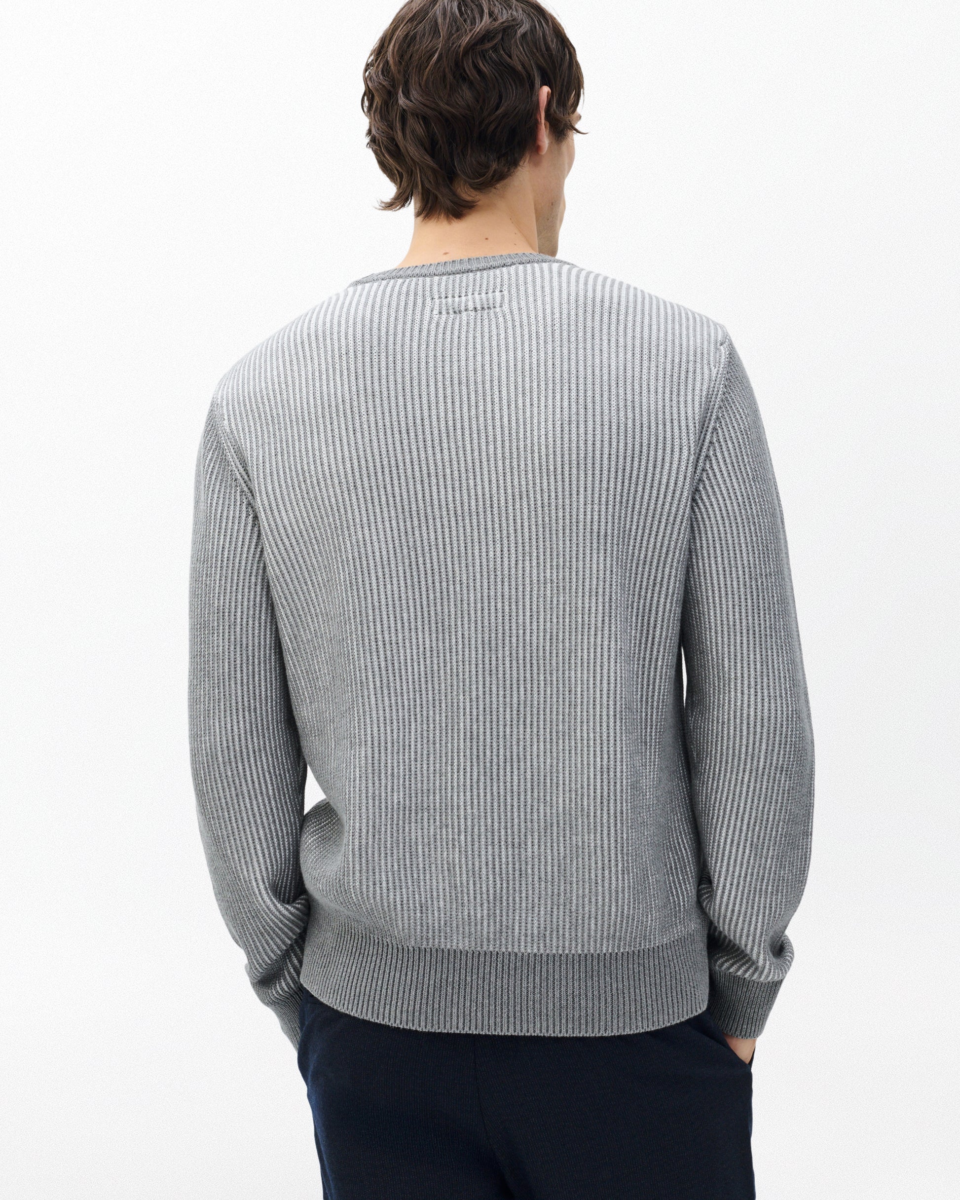 やわらかなコットンヤーンを使用したクルーネックセーター。2色使いの表情豊かな編み柄が奥行きと立体感を演出。ライトカラーのデニムやシンプルなチノパンツと好相性です。