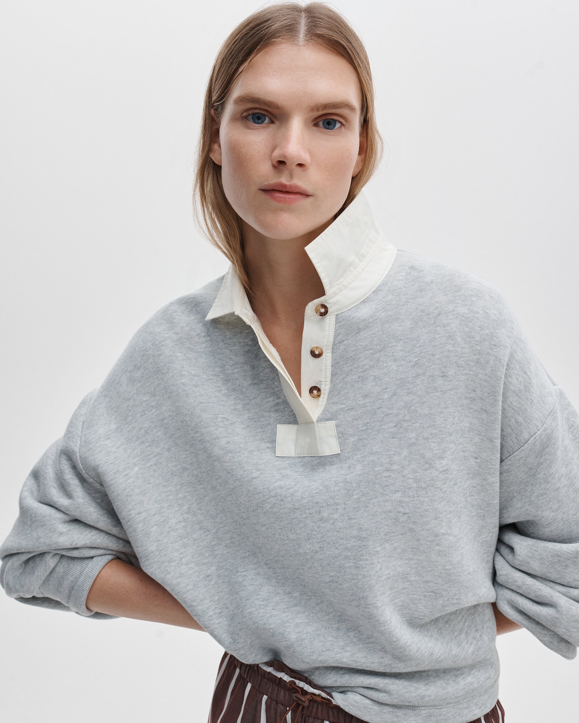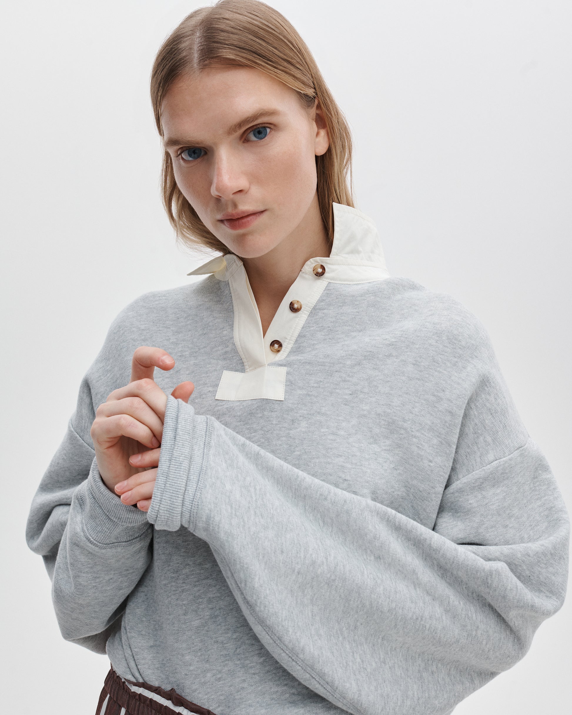柔らかく洗い加工を施したコットン混ループテリー素材を使用。ゆったりとしたオーバーサイズで楽に着ていただけます。