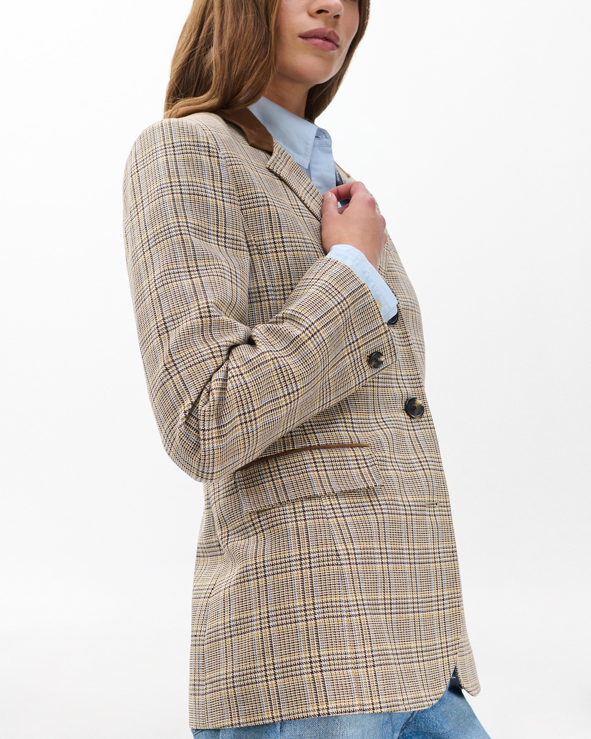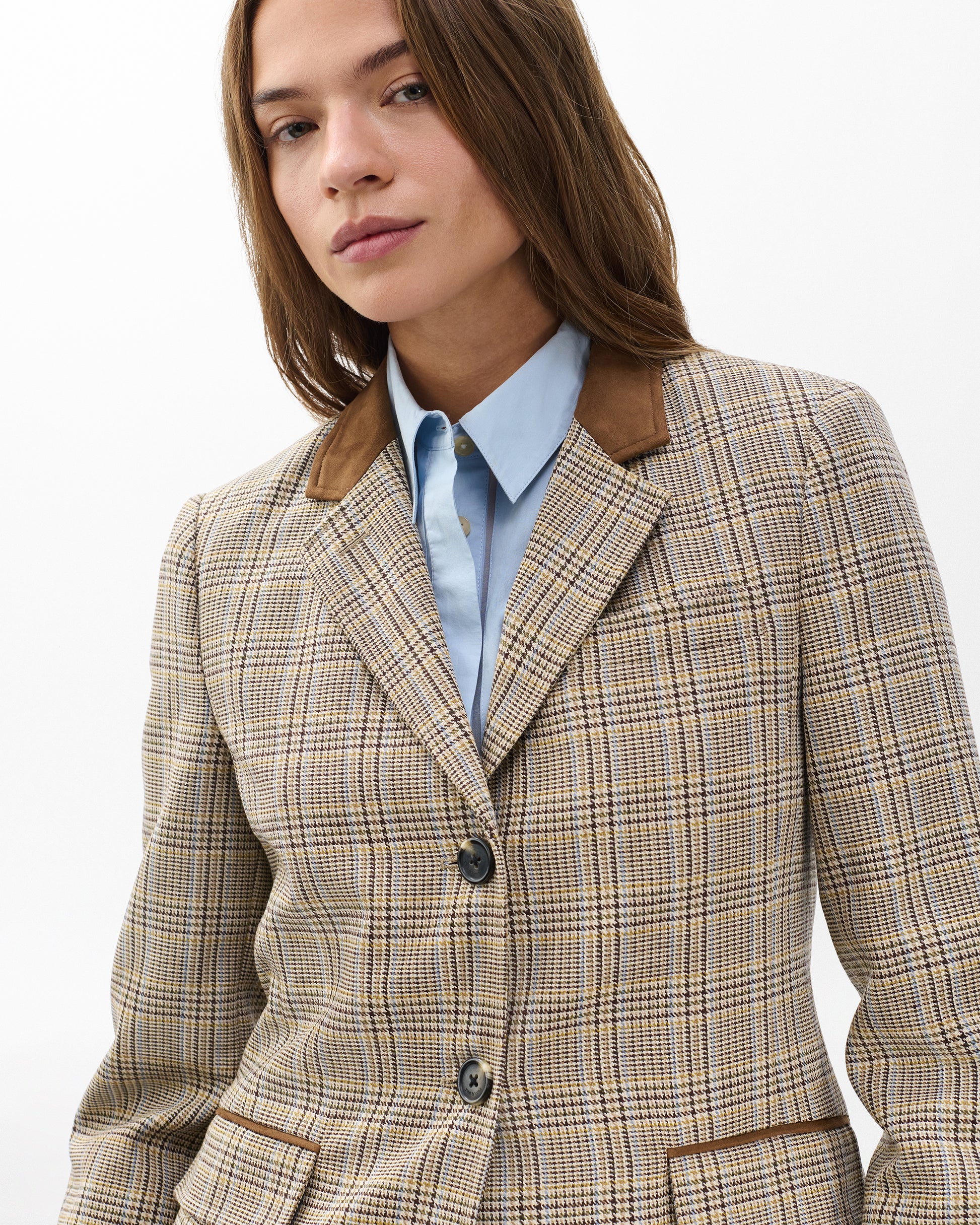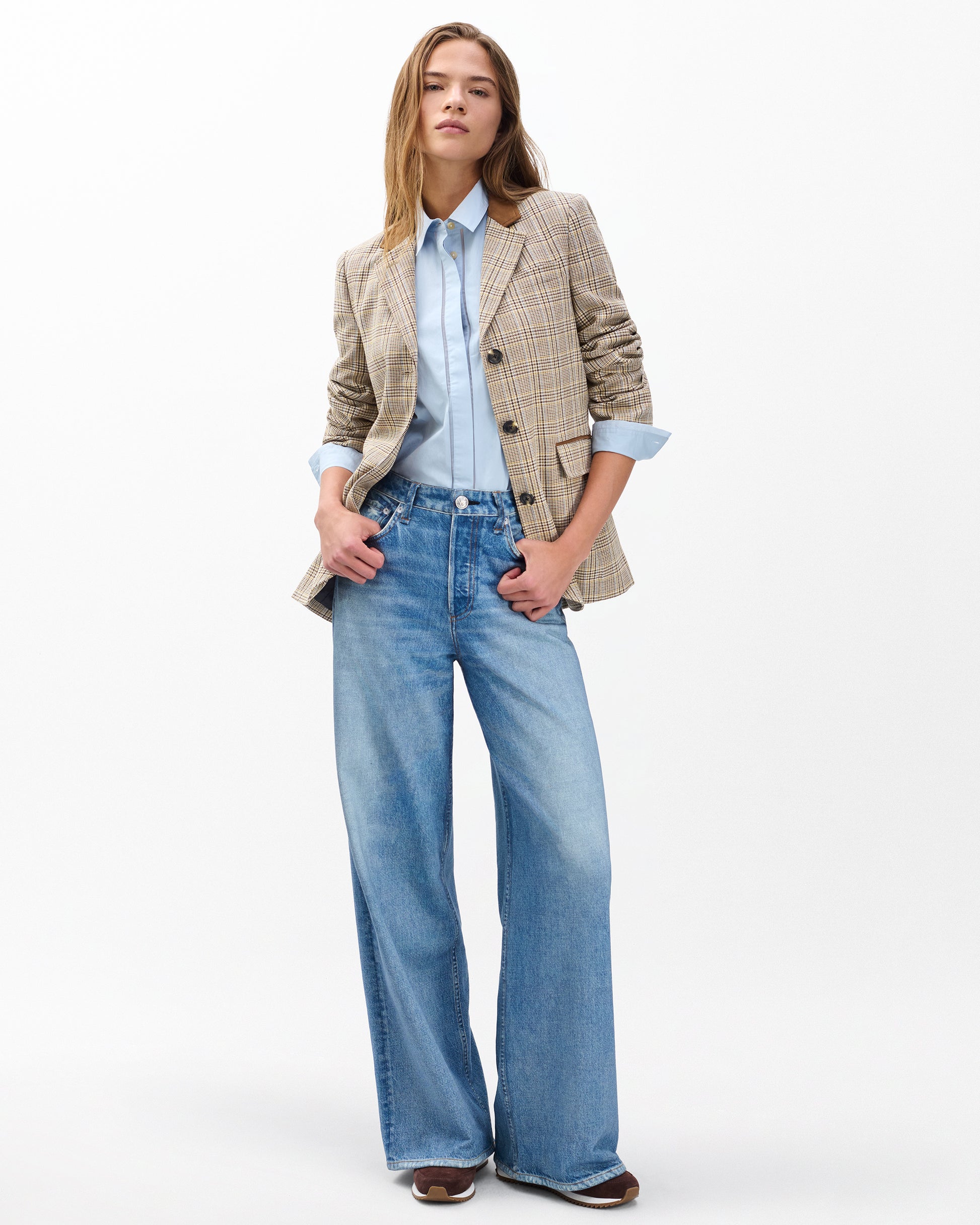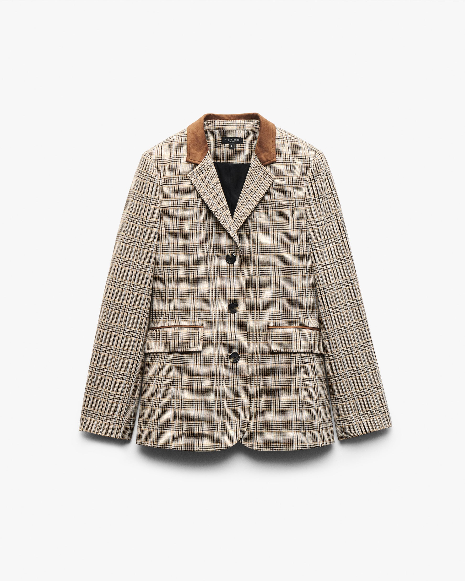 rag & bone オリジナルのカスタムチェックのブレザーは柔らかいウールブレンド素材で作られています。フェイクスエードの襟元が上品かつ、デザインを単調にさせないポイントとなっています。