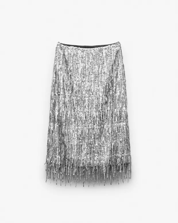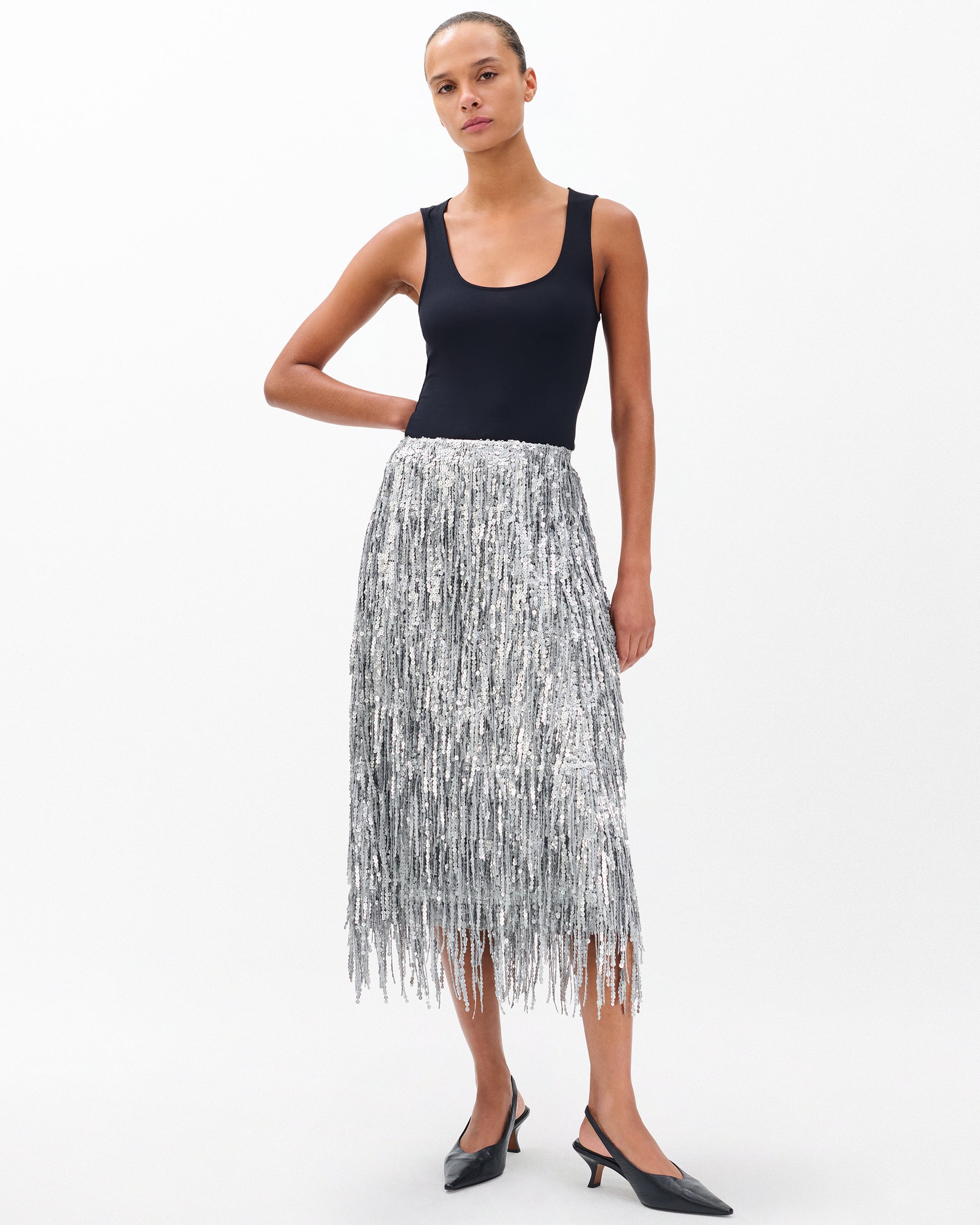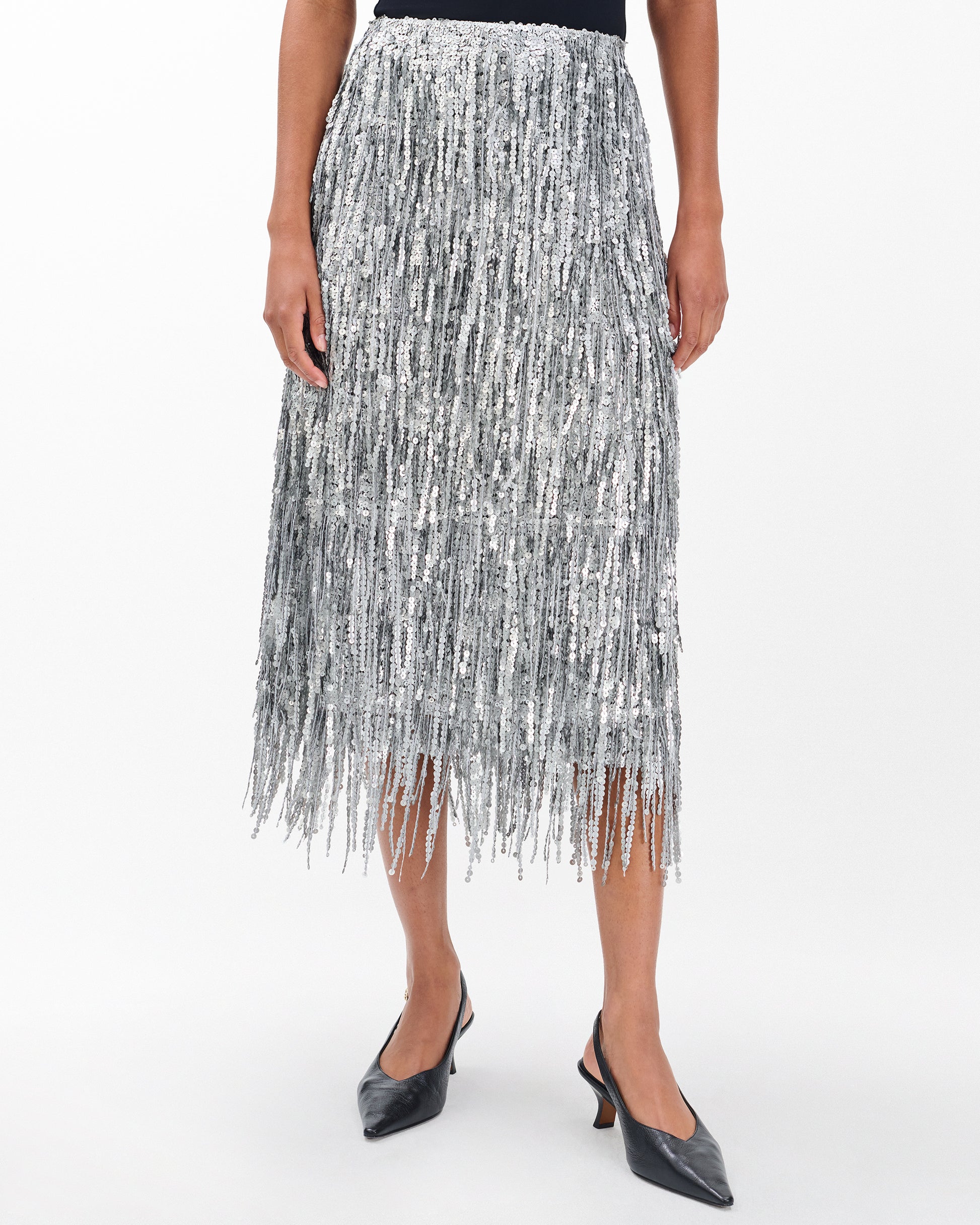 スパンコールがタッセルのように連なったデザインのスカートです。ウールのニットやスウェット、ジャケットなど異素材の組み合わせでスタイリングを楽しんでみてください。