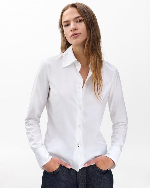 定番シャツを軽やかなコットンポプリン素材でアップデートしました。すっきりとしたスリムなシルエットはブレザーとの相性も良く、一枚で着てもサマになる万能アイテムです。