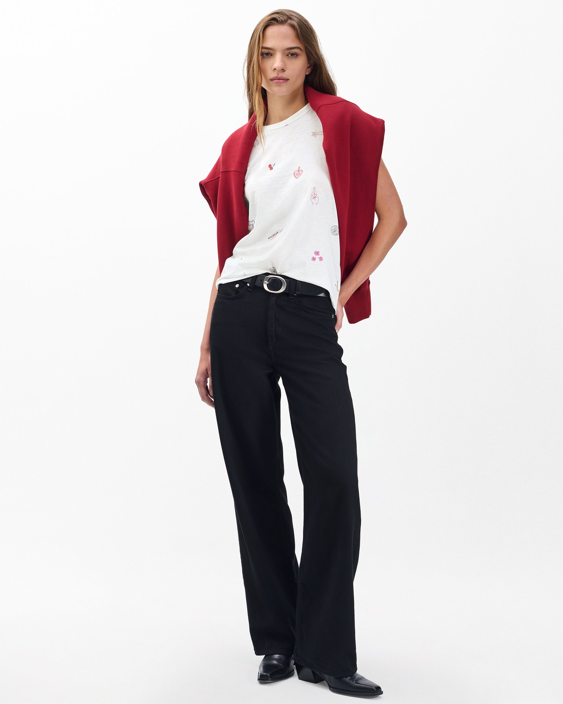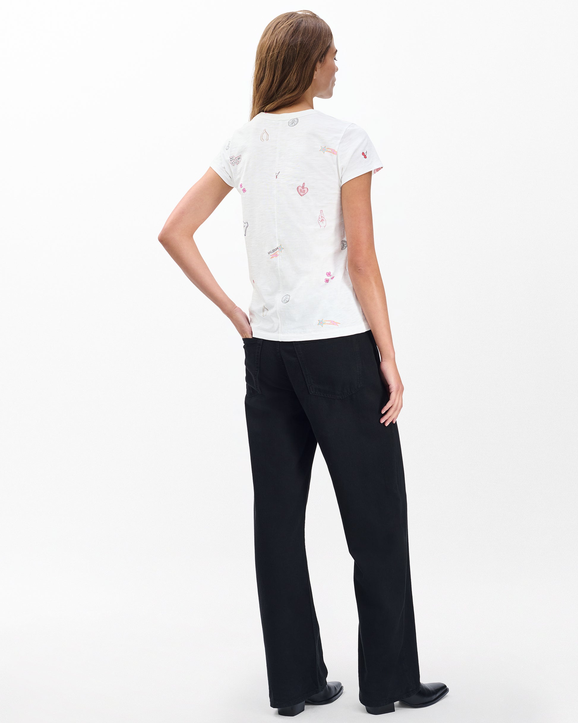 ボディは100%オーガニックコットンを使用。rag & boneの定番のファブリックです。やわらかな肌当たりがやみつきになるTシャツです。rag & bone オリジナルの総柄モチーフは四葉のクローバーやクロスした指、流れ星など幸運を呼ぶラッキーなグラフィックであふれています。