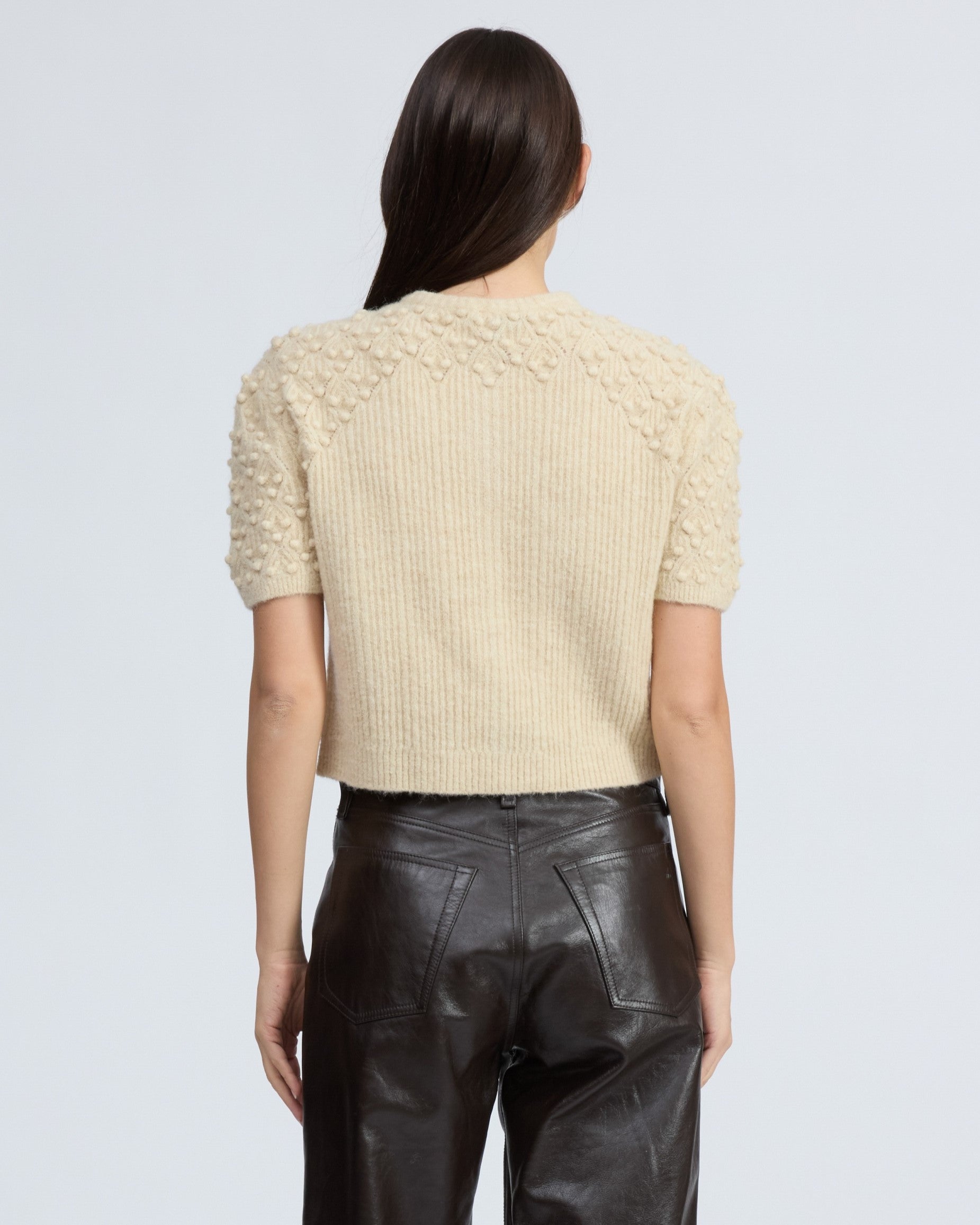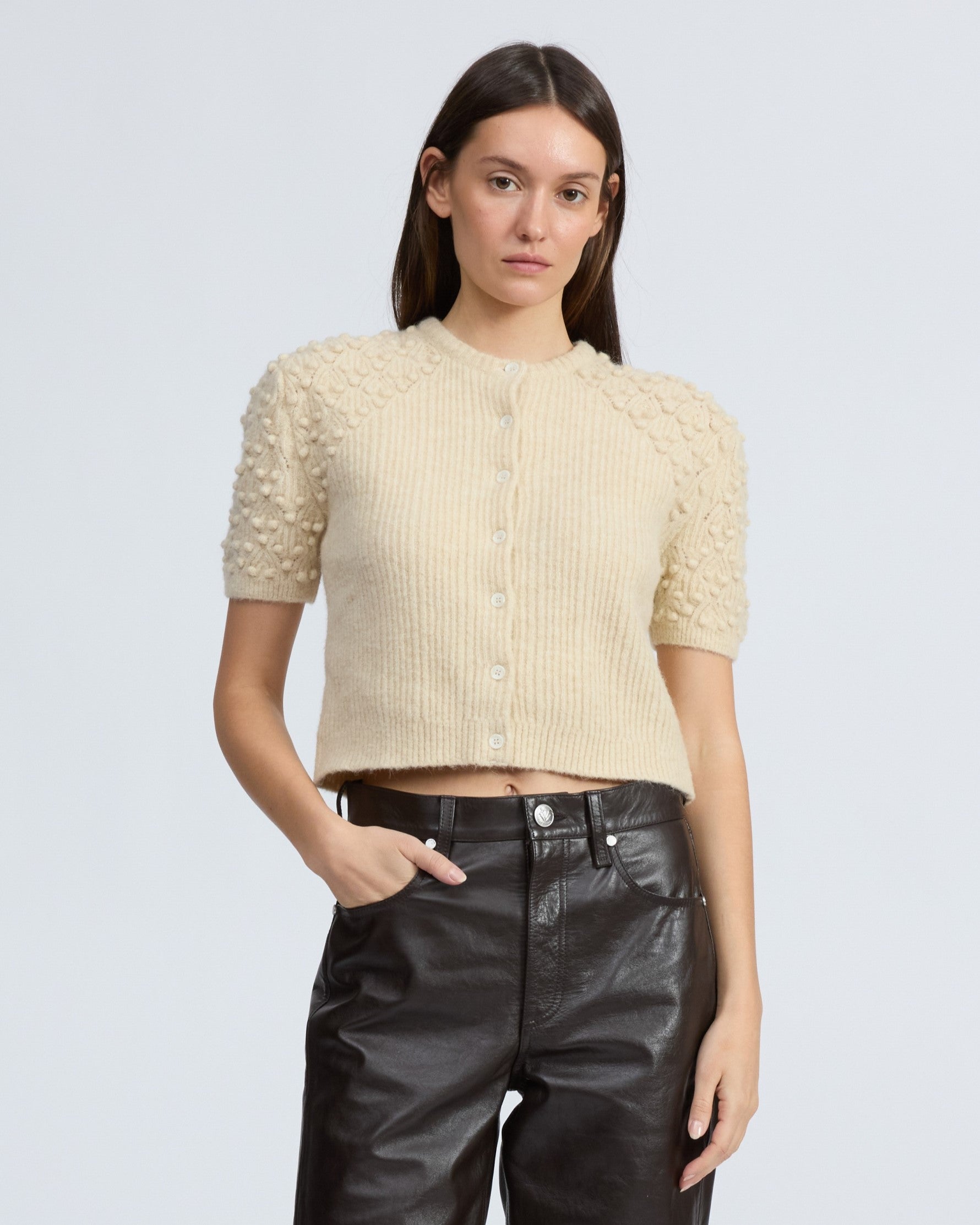 袖口から背中にかけてのアラン模様が特徴的なウールの半袖カーディガン。朝夕で気温差のある季節の羽織物としても活躍します。