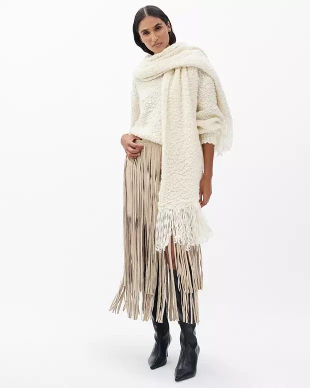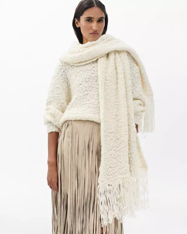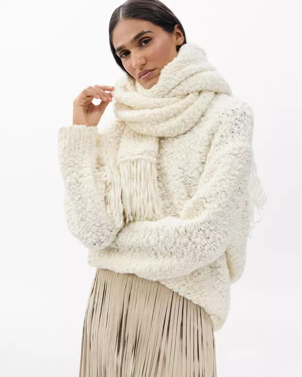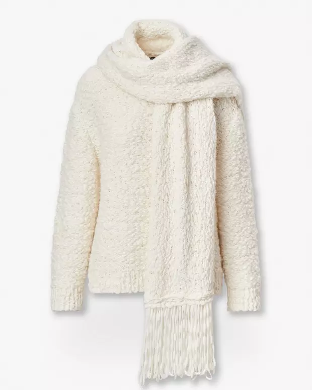 ゆったりとした着心地のセーターは背面についているボタンでスカーフの取り付けが可能になっています。セットでデザインニットとして楽しむことをオススメします。冬の旅行にも活躍するアイテムです。