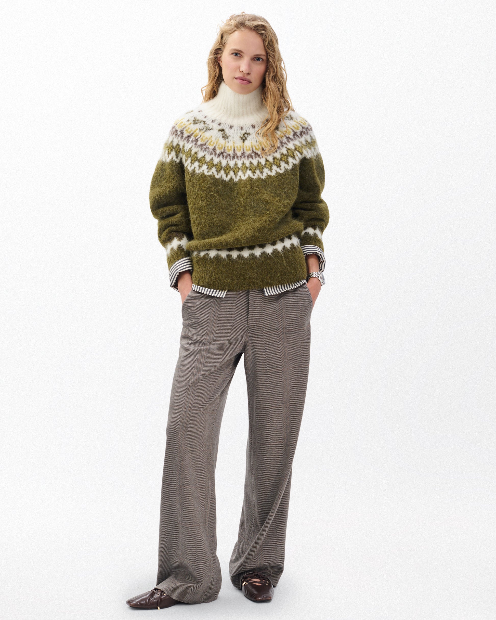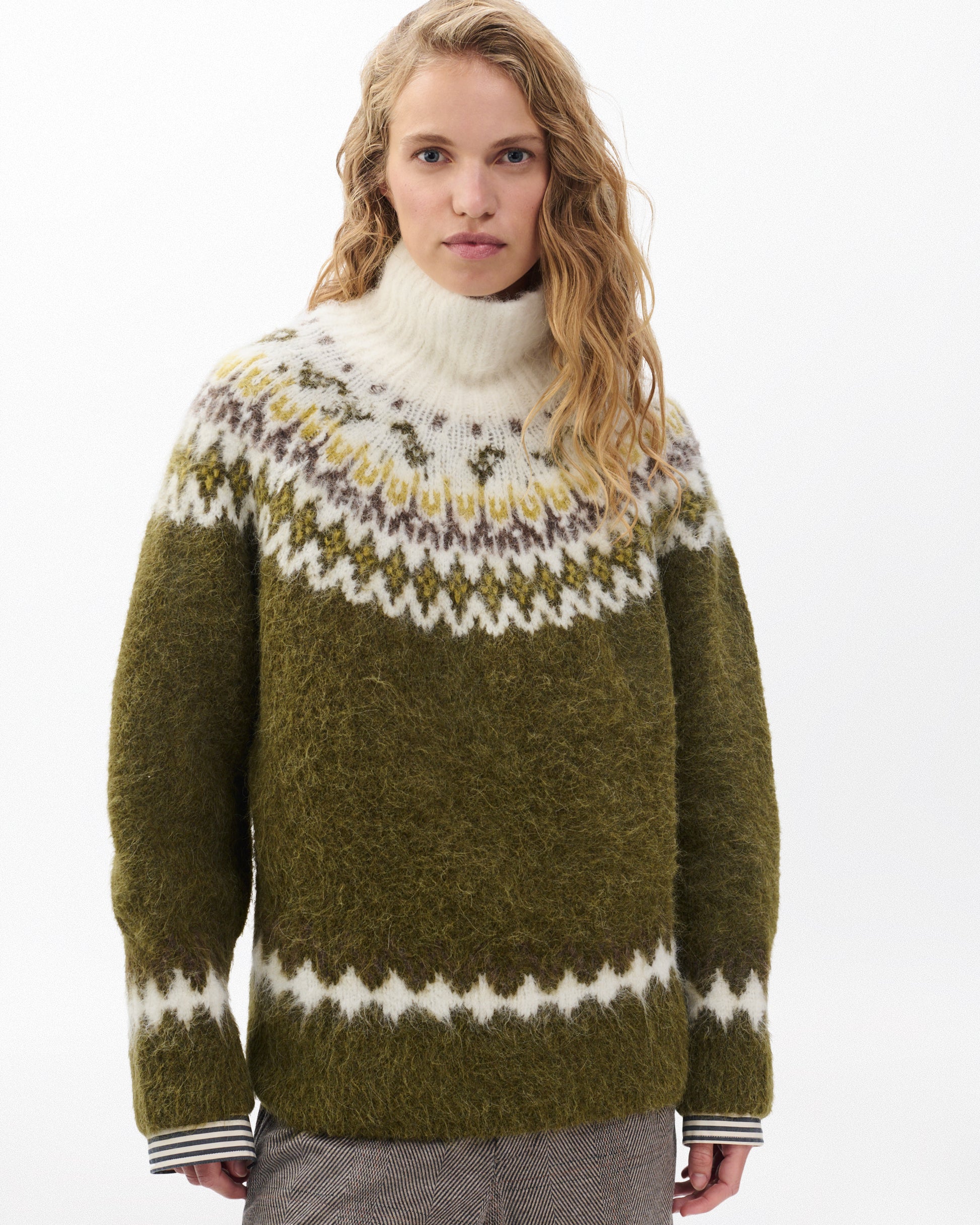 伝統的なフェアアイル柄が目を引く、タートルネックのセーターです。