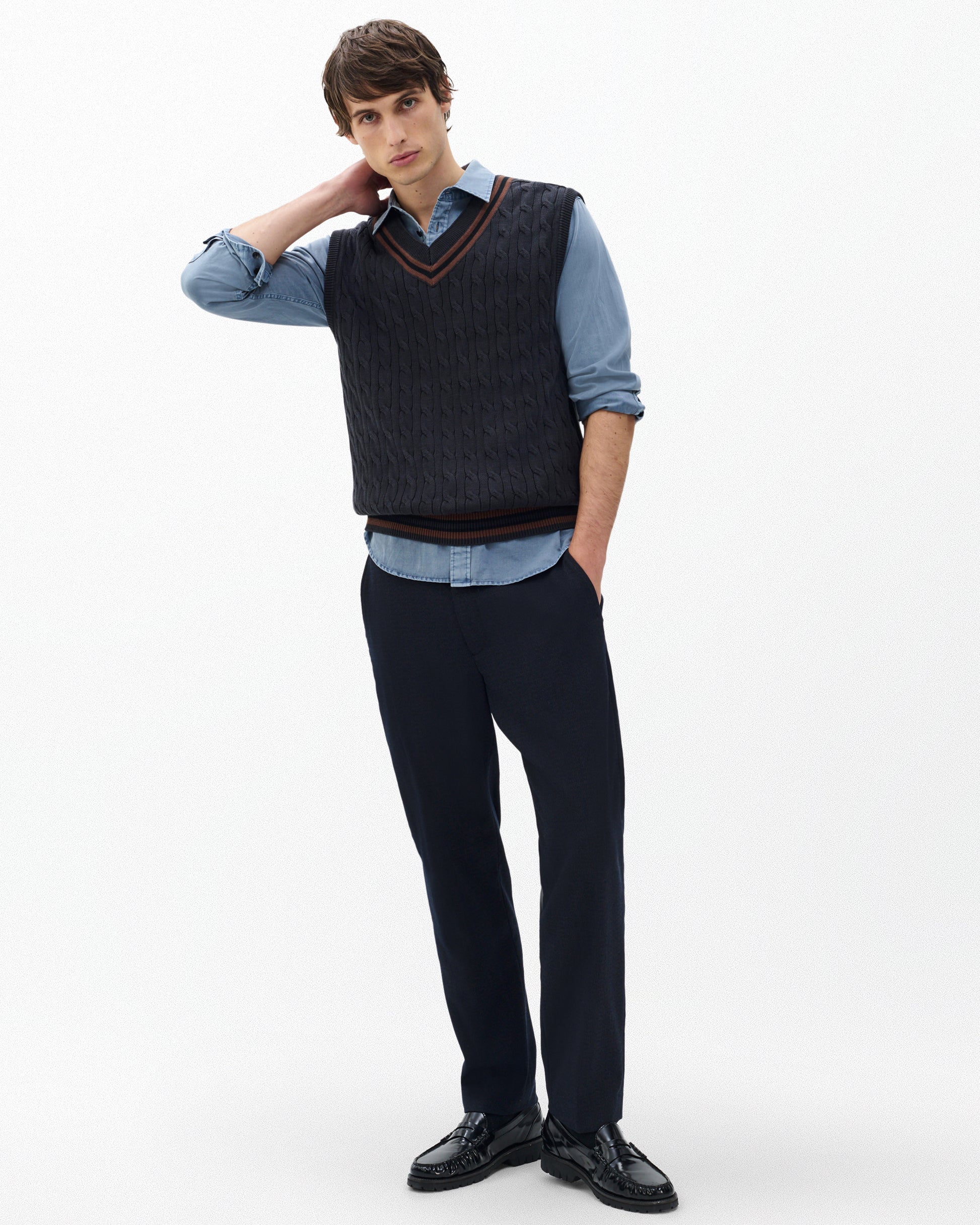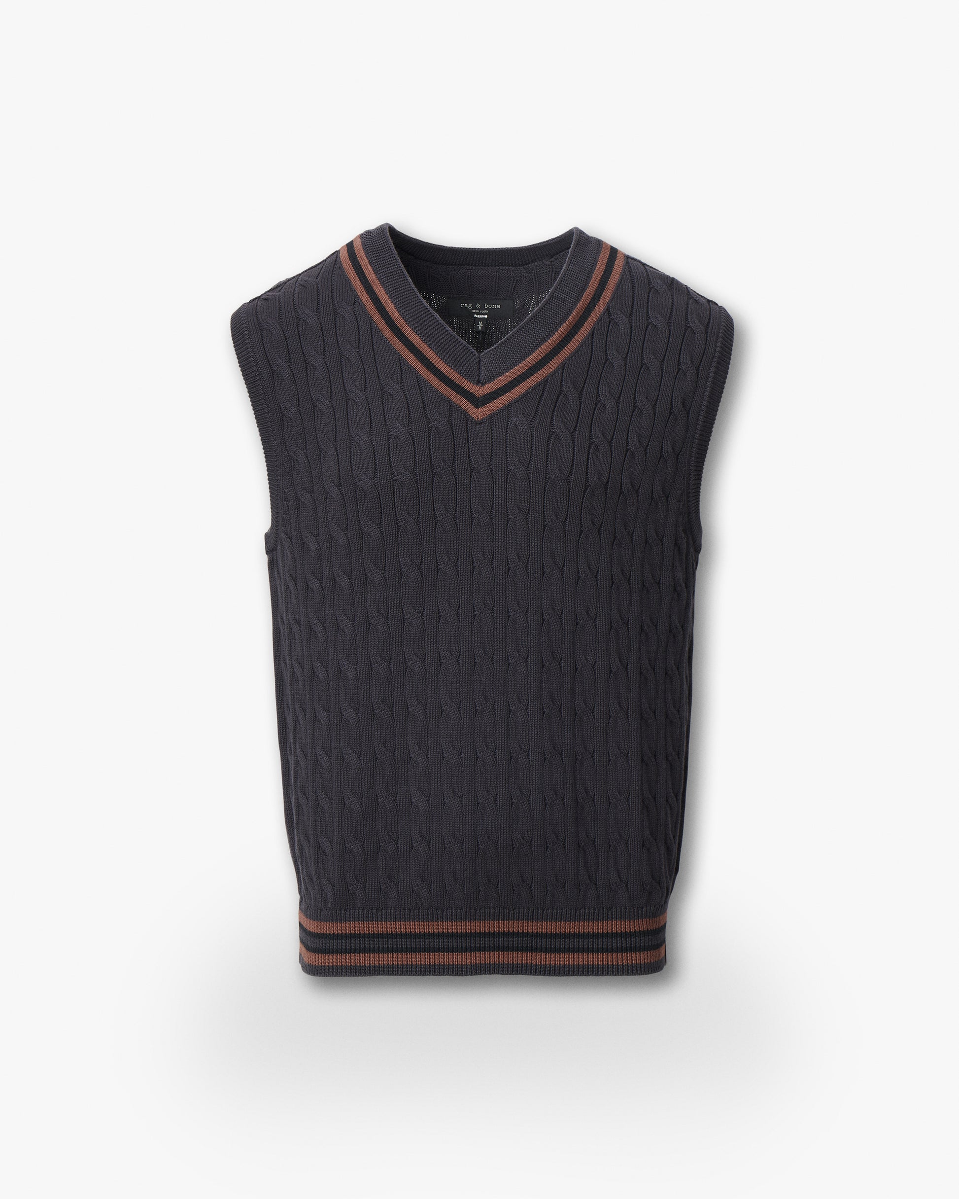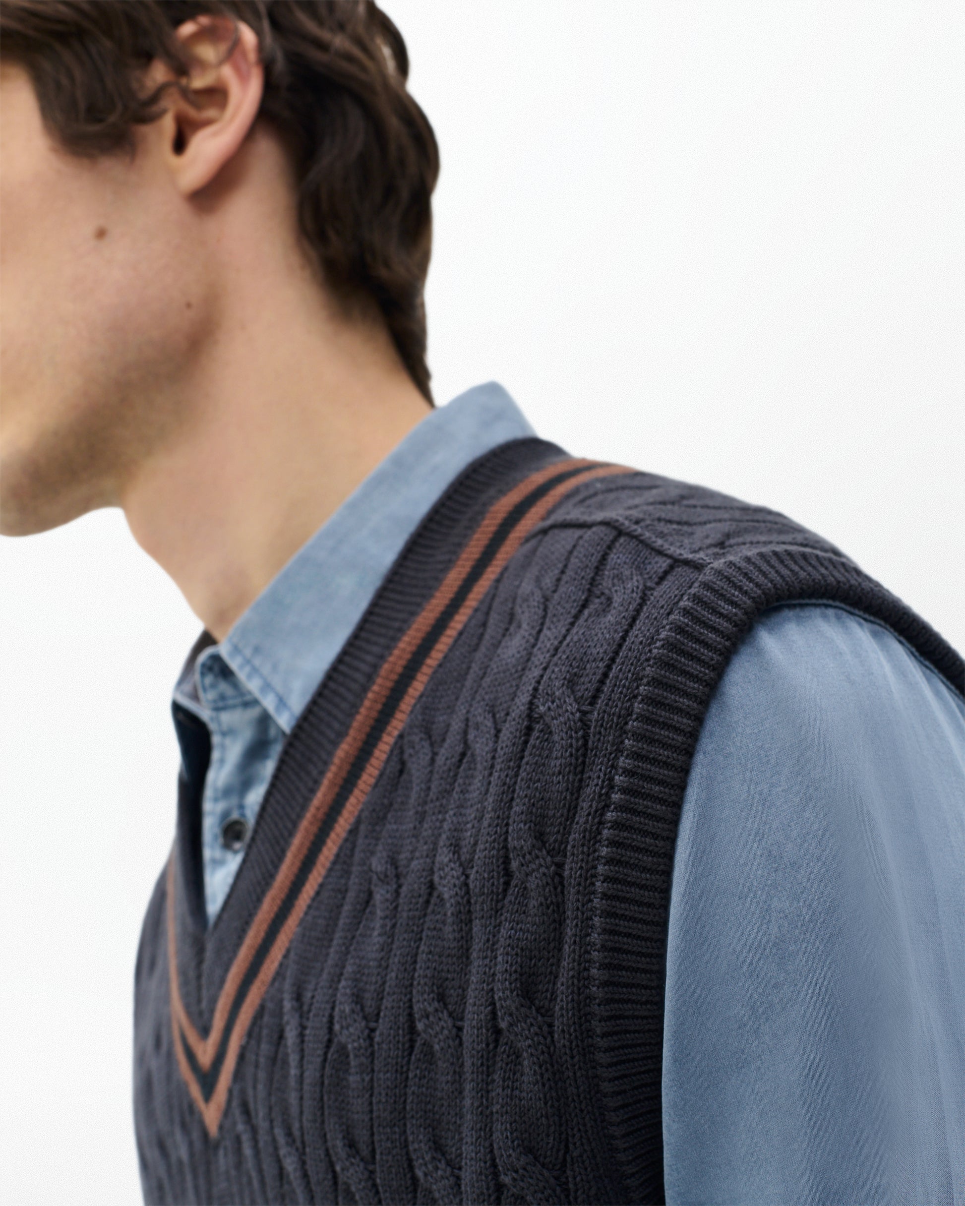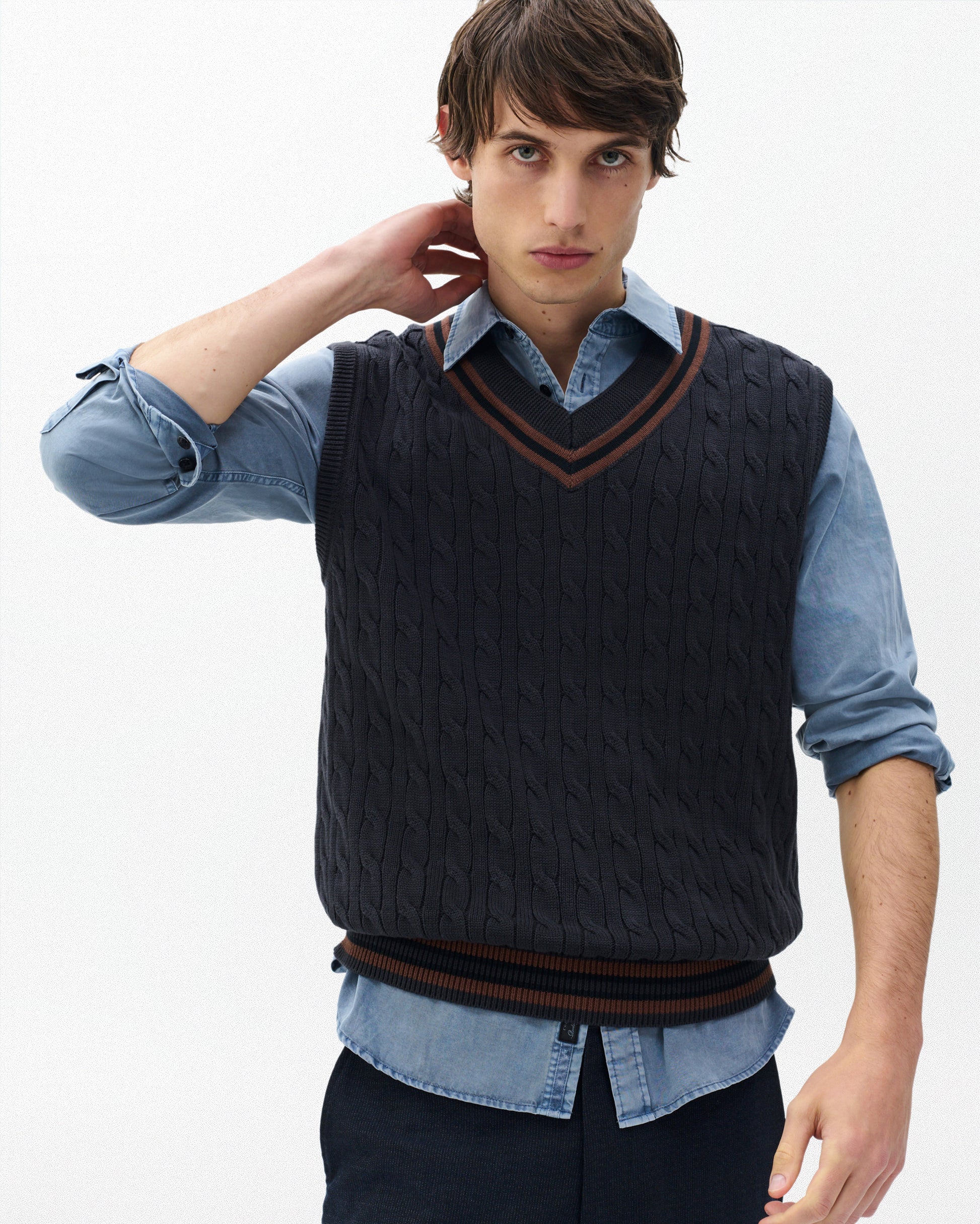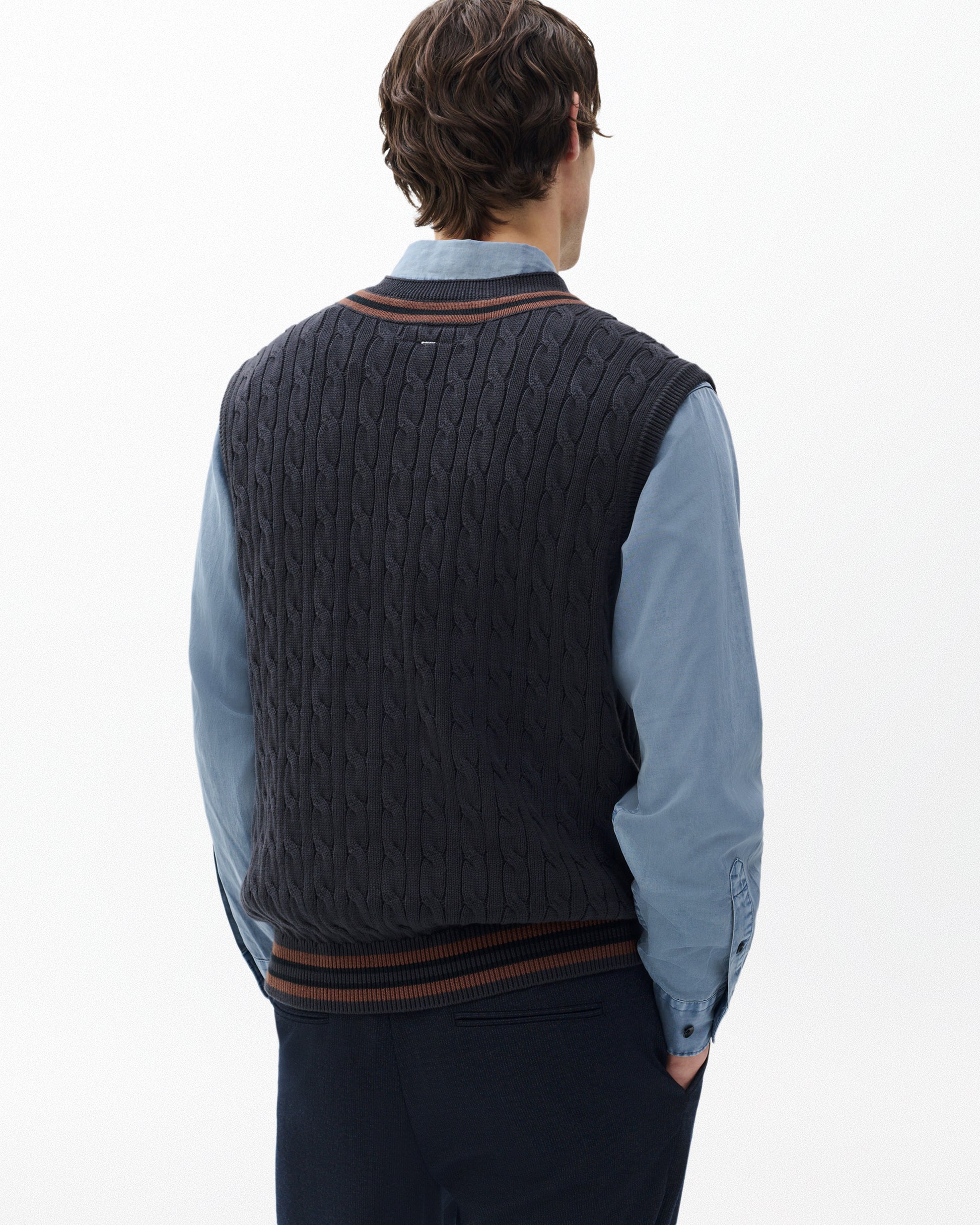 クリケットユニフォームの伝統にインスパイアされたニットベストは、柔らかなコットンのケーブル編みで、コントラストの効いたストライプで縁取りされています。シンプルなボタンダウンシャツやTシャツの上に重ね着すれば、プレッピーでレトロなカレッジスタイルを演出できます。