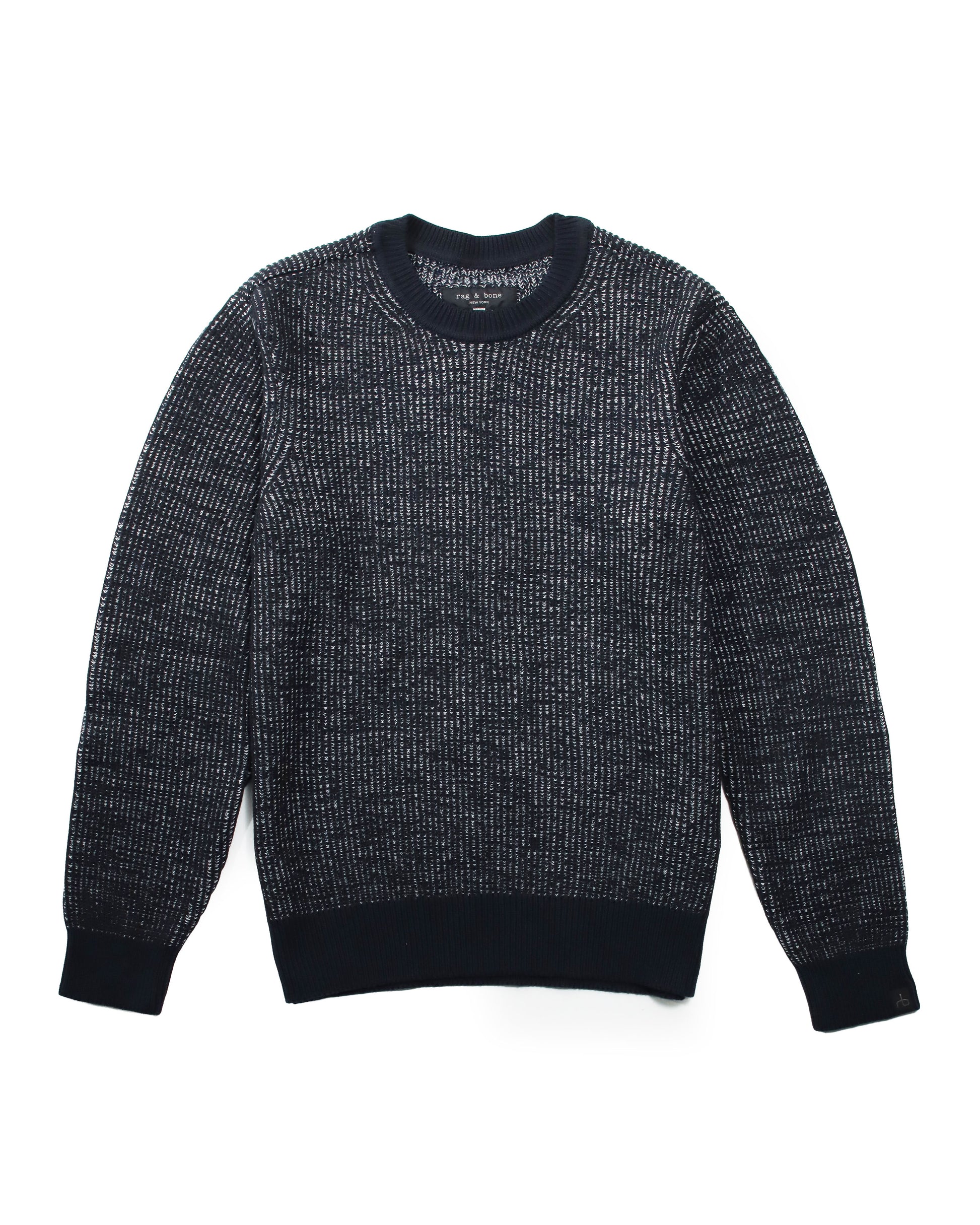 やわらかなコットンヤーンを使用したクルーネックセーター。2色使いの表情豊かな編み柄が奥行きと立体感を演出。ライトカラーのデニムやシンプルなチノパンツと好相性です。