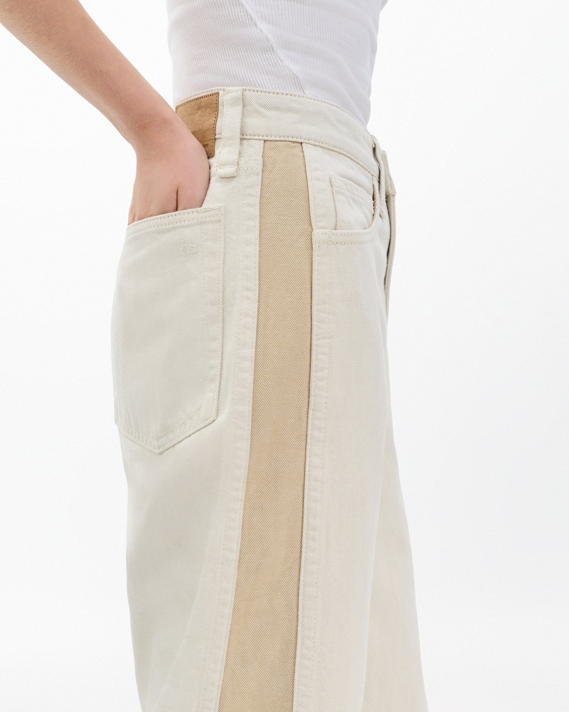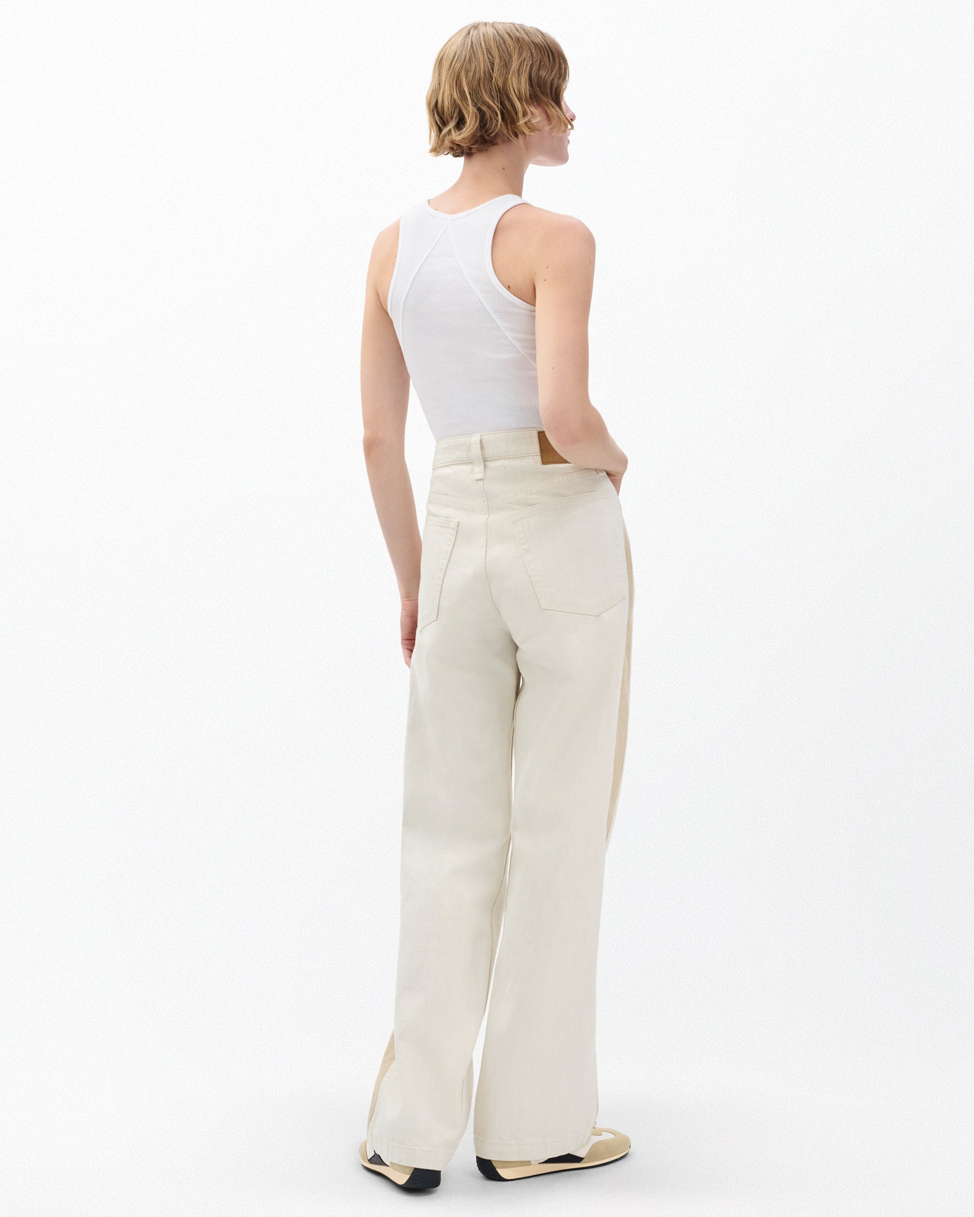 サイド部分だけ異なったカラーのデニムを縫い合わせた、ツートーンデザインです。