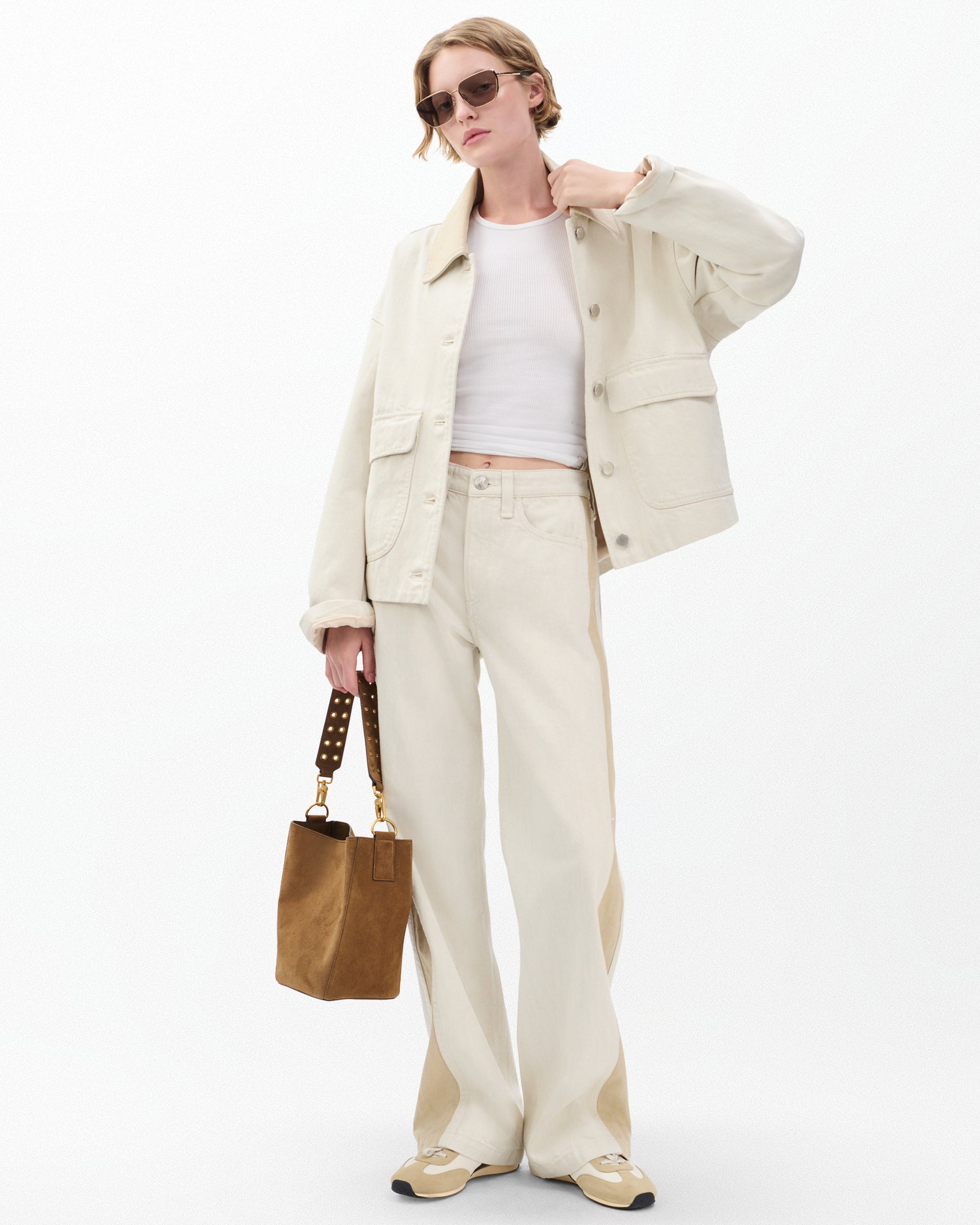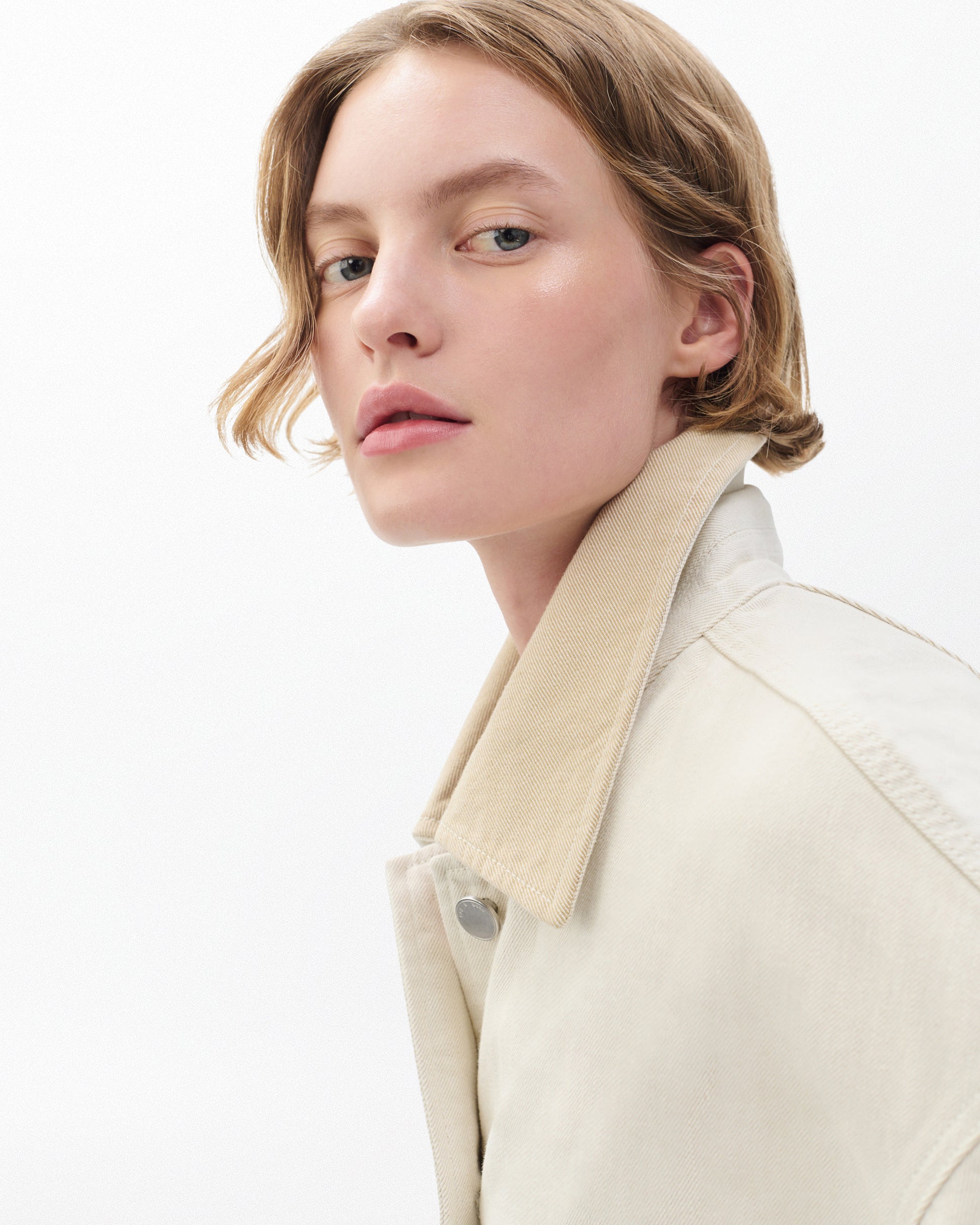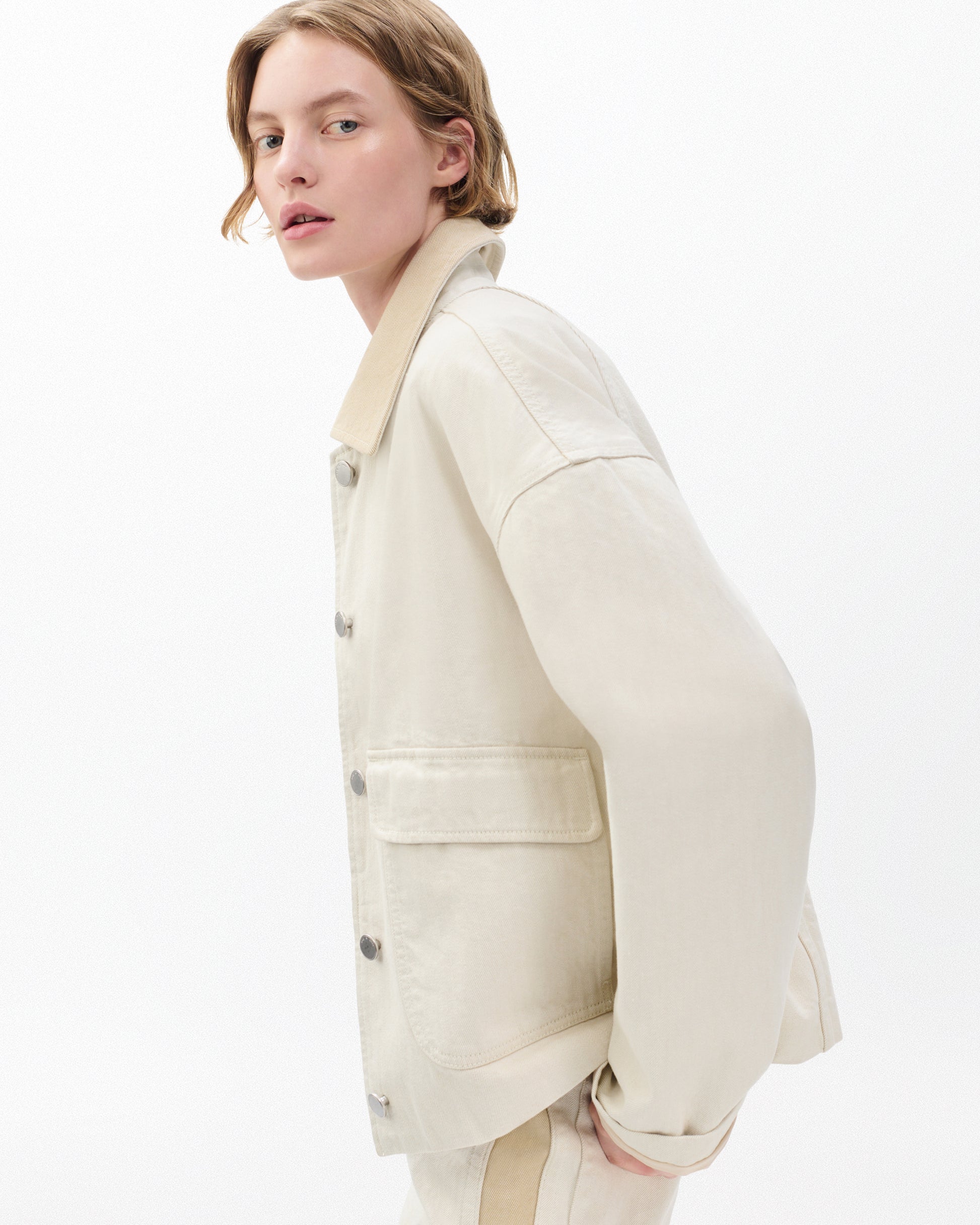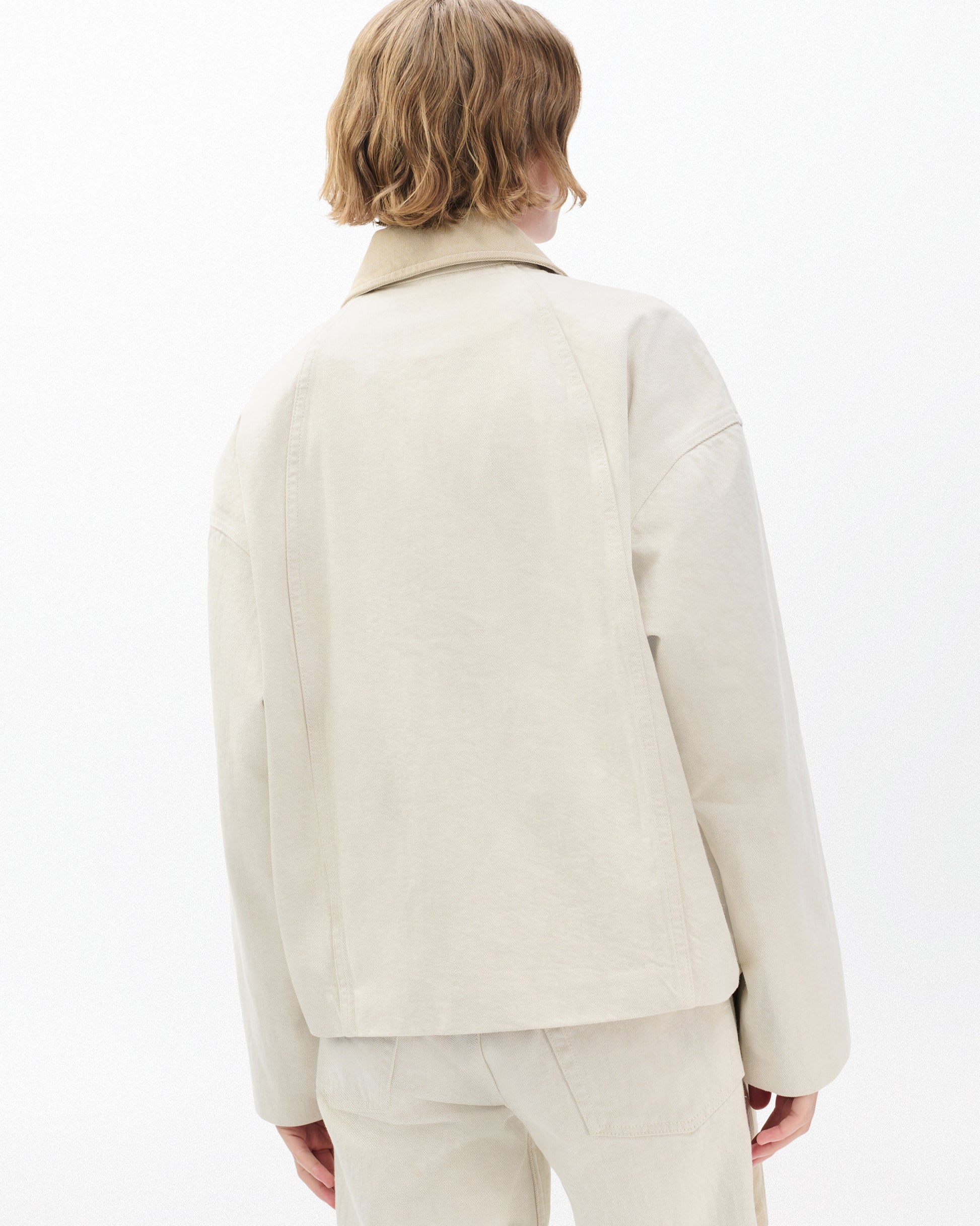 季節の変わり目に最適な軽量リジッドノンストレッチデニムを使用したジャケットです。しっかりとした生地でありながら、着込むほどに柔らかく快適な着心地へと変化します。柔らかなエクリュカラーに、コントラストの効いたサンドストーンカラーの襟が特徴です。同色の「ローガン スプライス ワイド ジーンズ」と合わせれば、完璧なコーディネートが完成します。