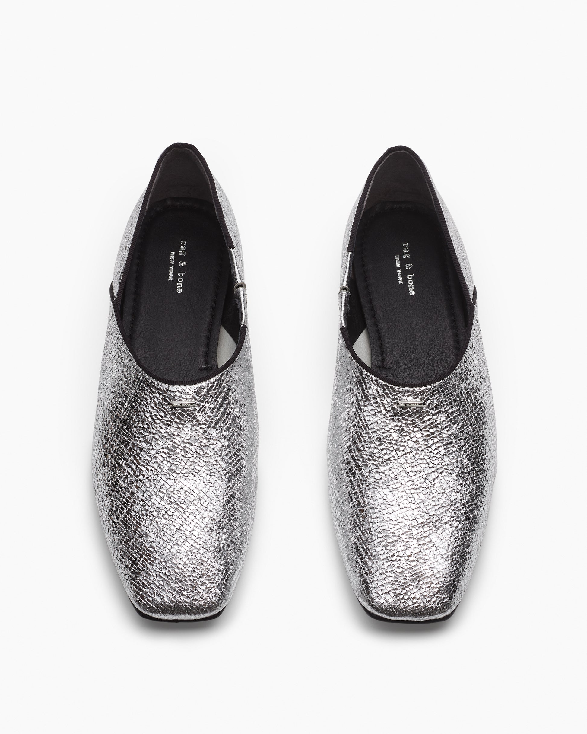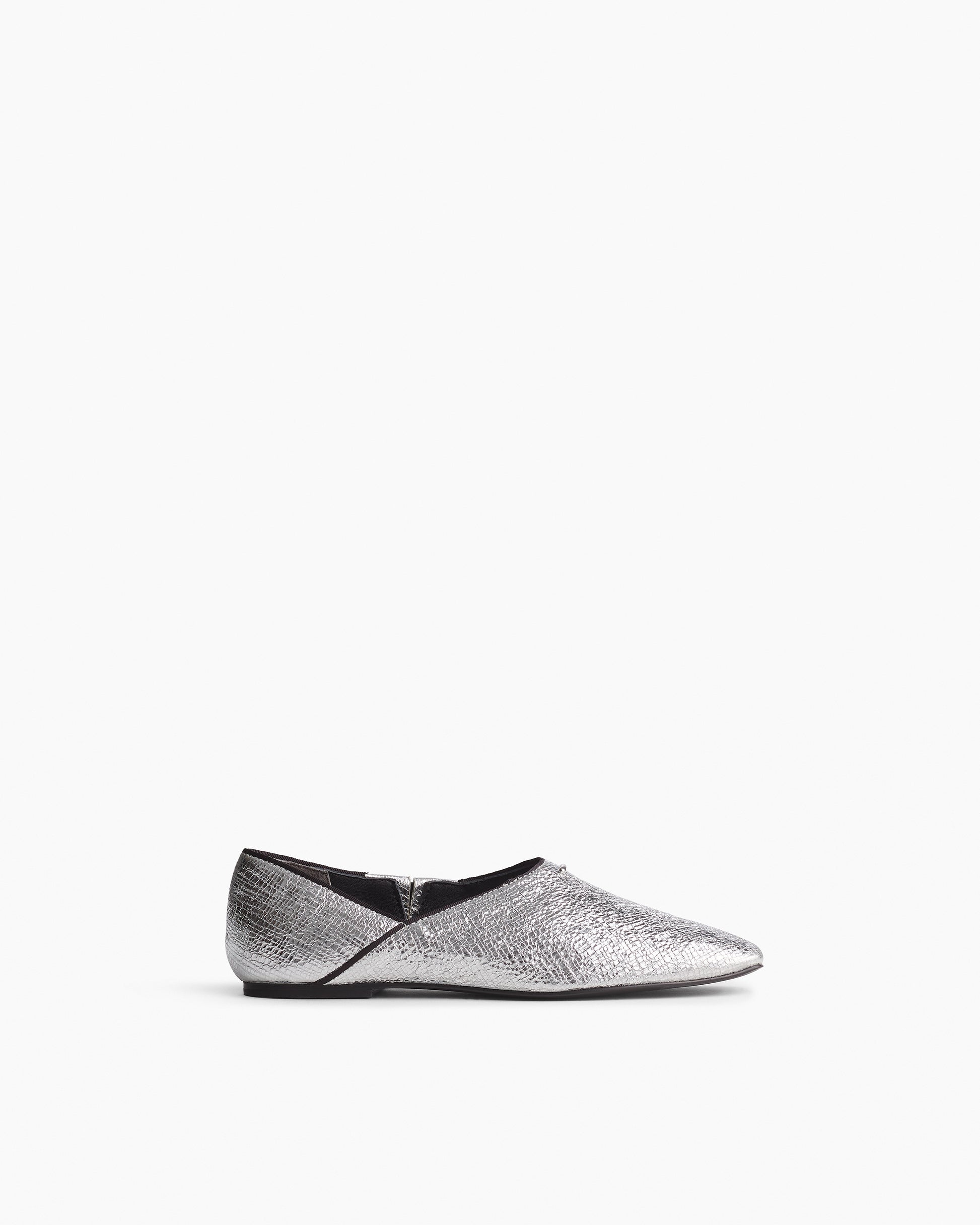 コーディネートのポイントになるメタリックのフラットシューズ。オーソライト社製の抗菌インソールは低反発でクッション性が高く、履くたびに快適な履き心地を実感できます。歩きやすさも抜群で長時間歩いても疲れにくい構造です。