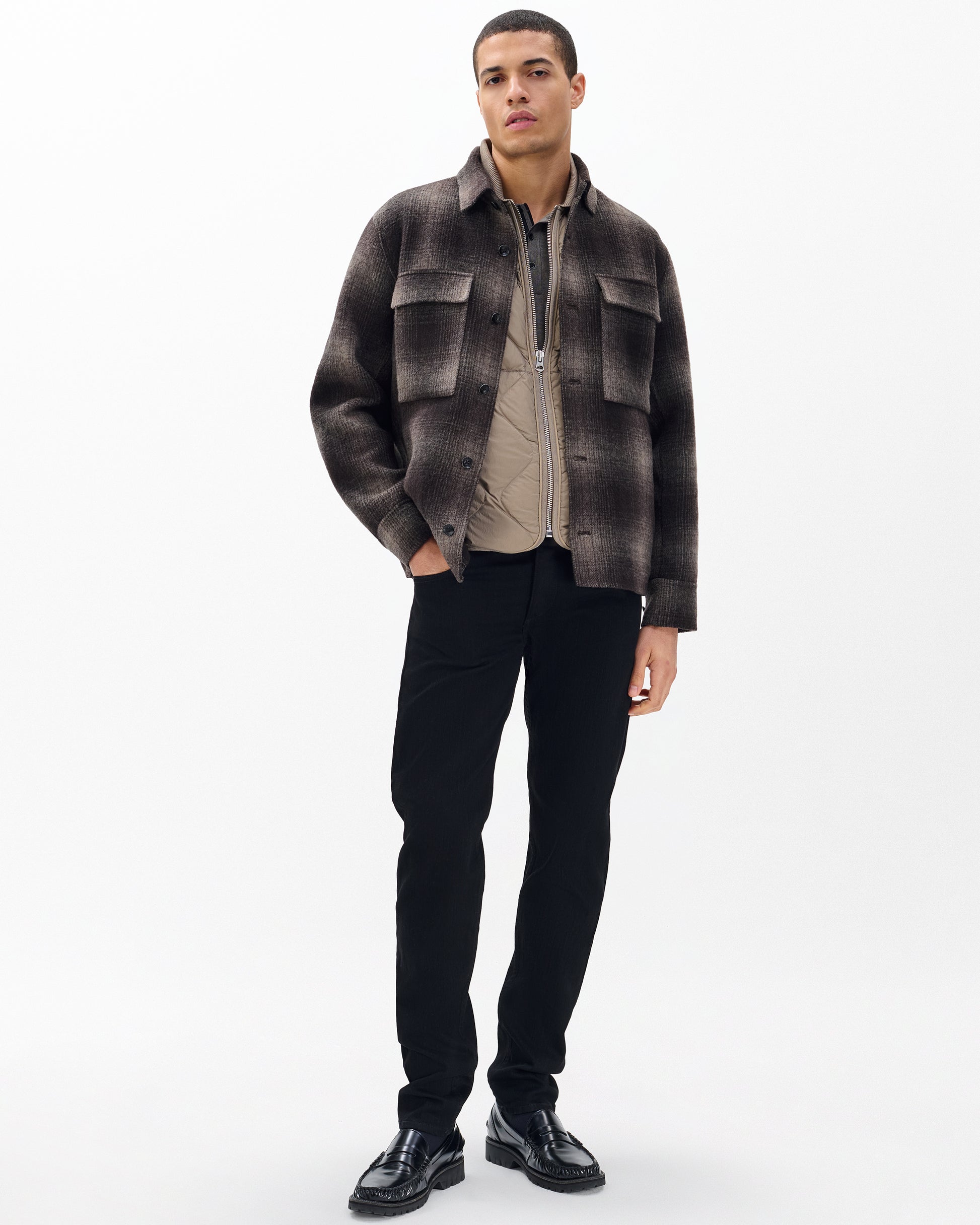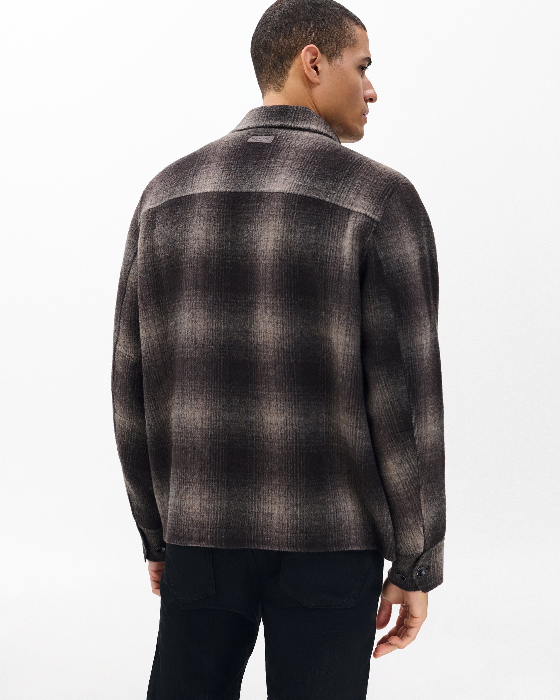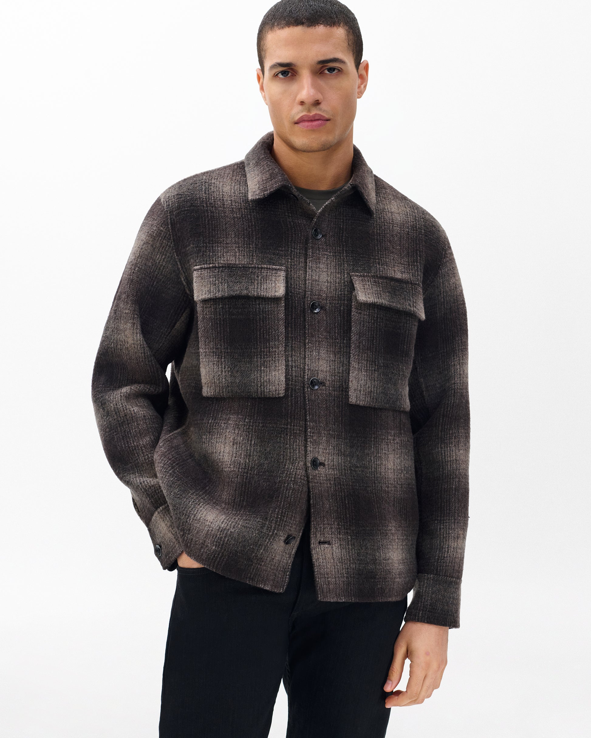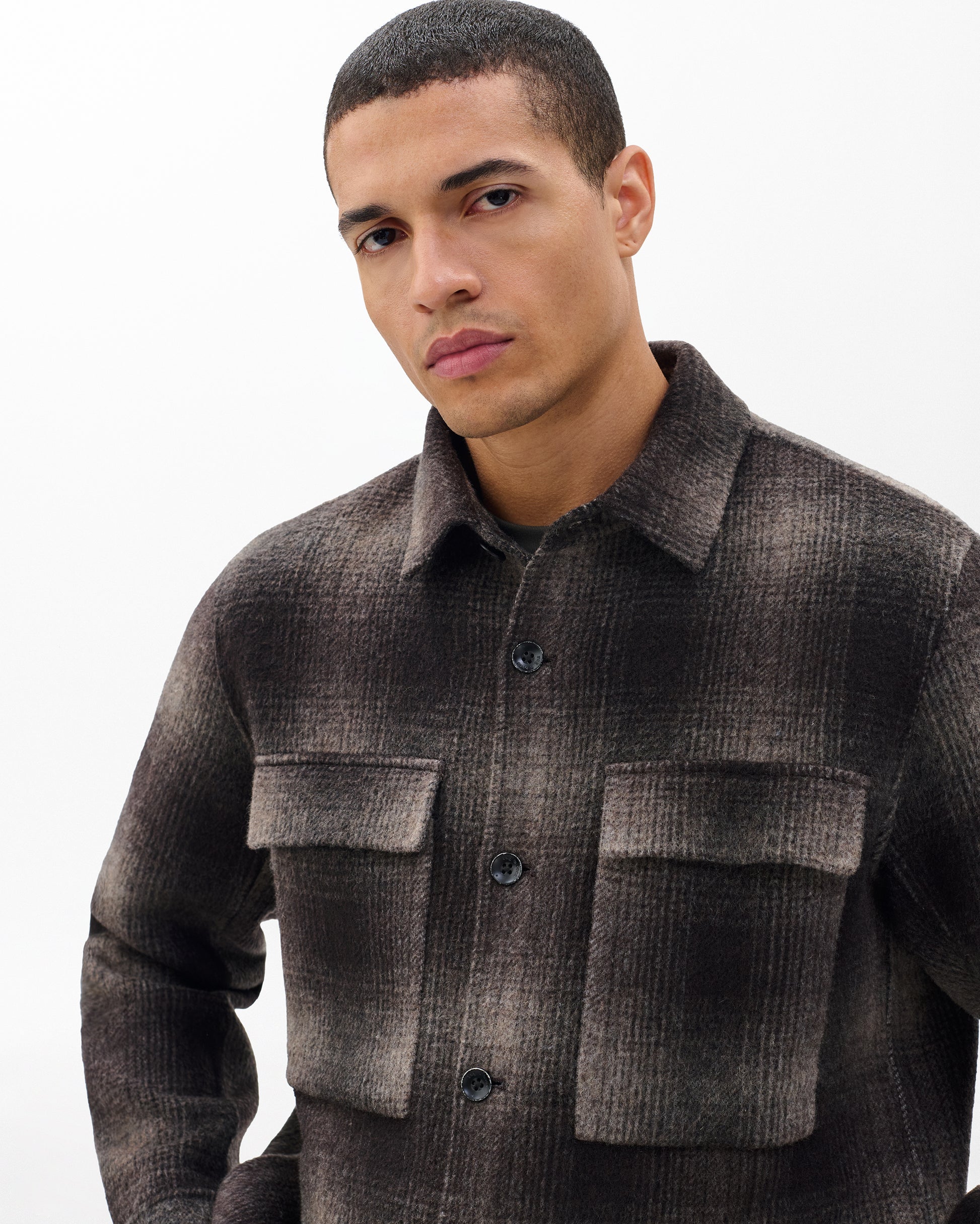 イタリアの老舗生地メーカー「ベランディ」と共同開発の柔らかくて肌ざわりの良いダブルフェイスのウール混素材を使用しています。ぼんやりとしたチェック柄は、自社のデザインチームが特別にデザインしています。えりの形やボタン、ポケットの作りなど、細かい部分まで丁寧に仕上げています。