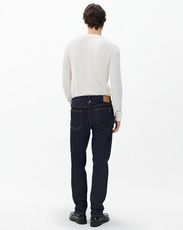 上質な「rbセルビッジデニム」は、日本の老舗デニムメーカー「日本綿布」と協業して作られた特別な生地を使用しています。伝統的な織機で丁寧に織られた生地は織り目の不均一な味わいとタフな質感が特徴です。履き込むほどに色落ちやアタリが生まれ、あなただけの1本に育っていきます。さらに、rag & bone のロゴ入りのオリジナルセルビッジラインが施されています。