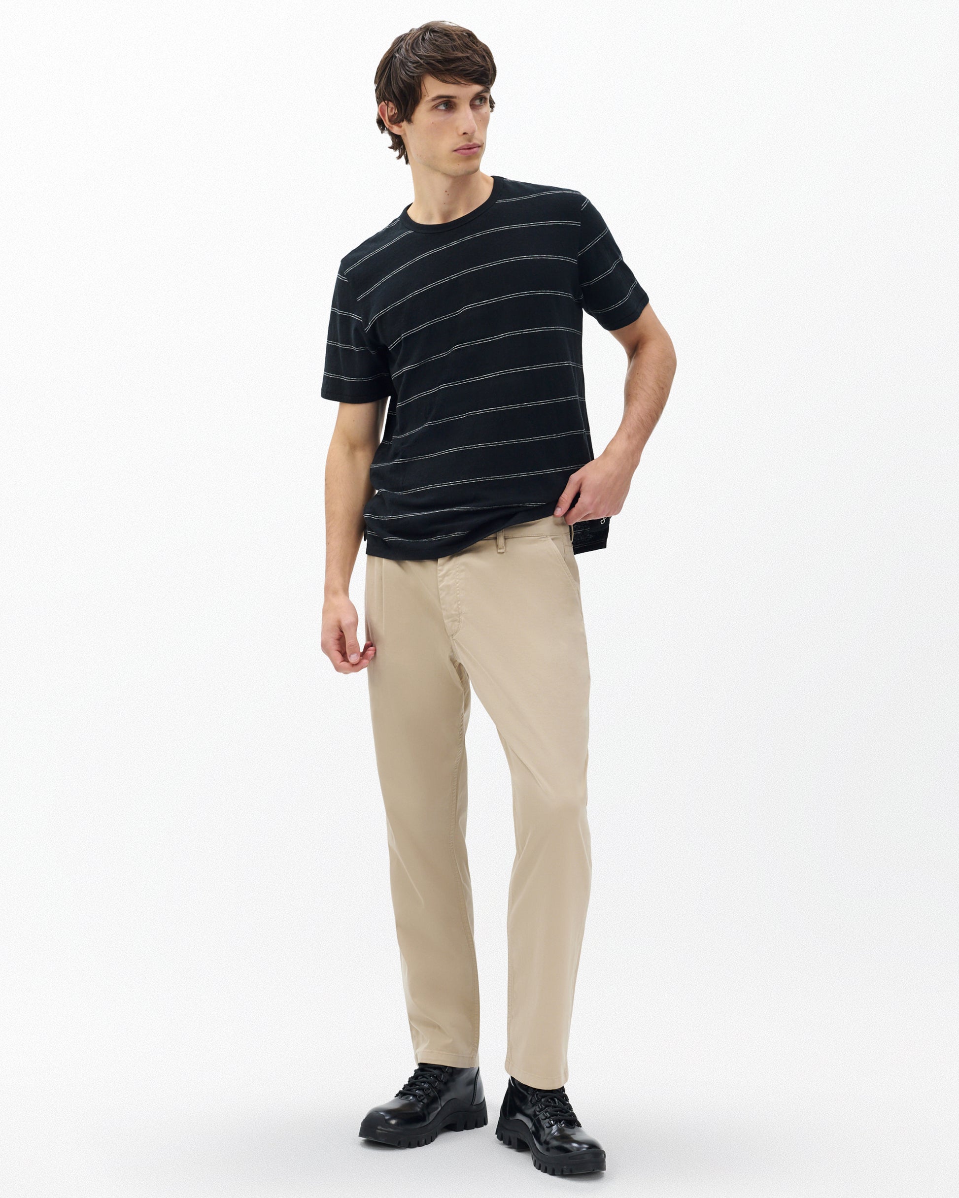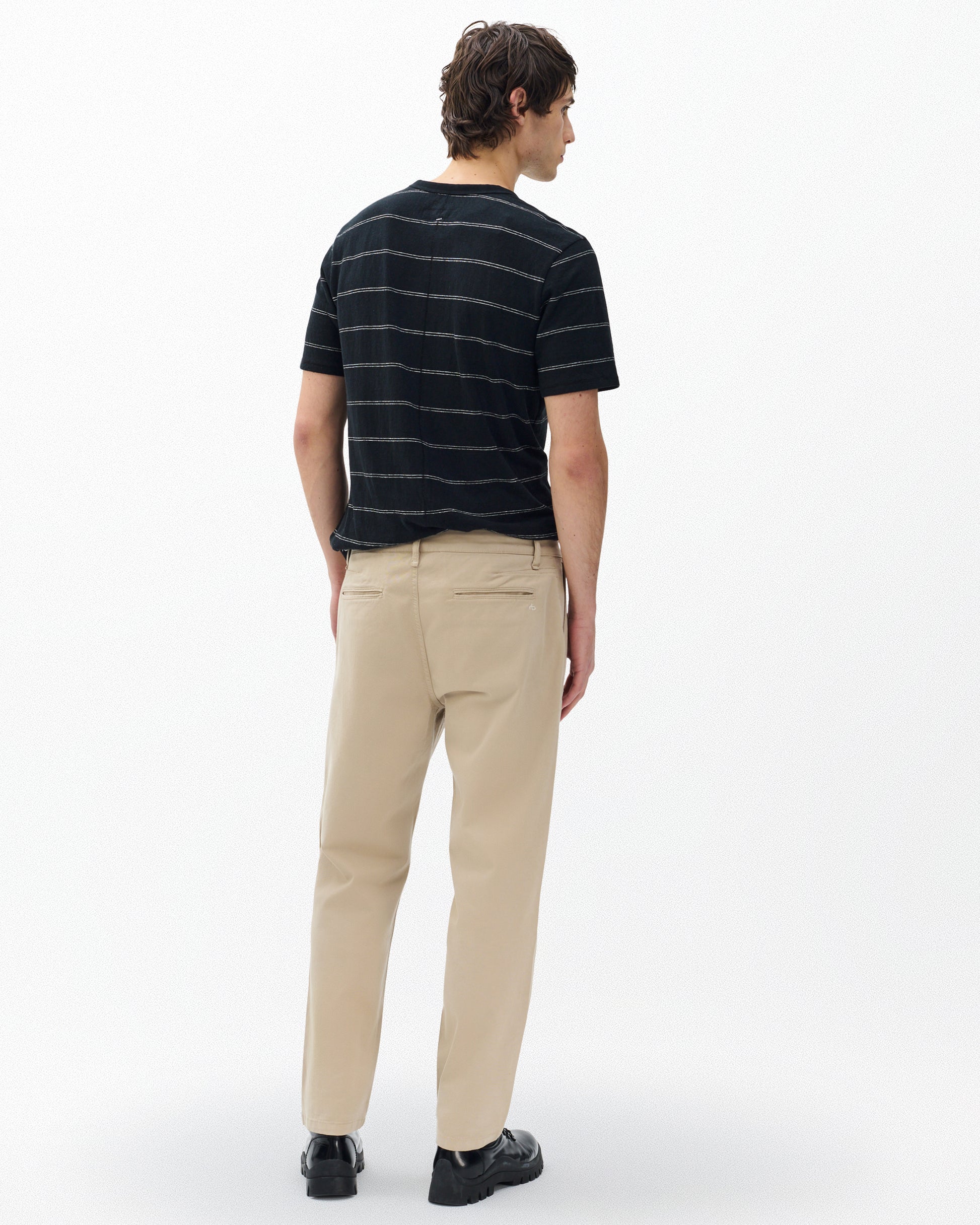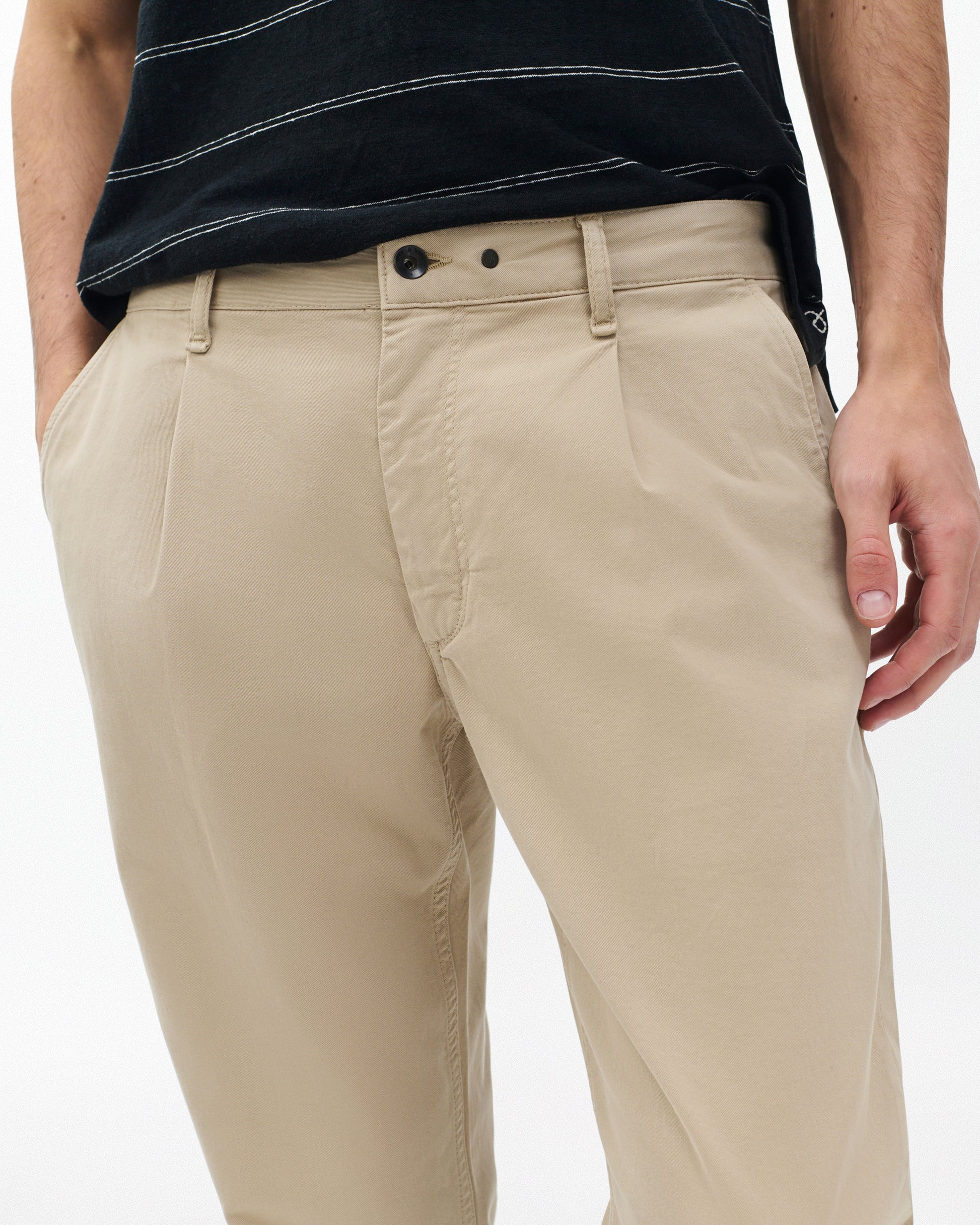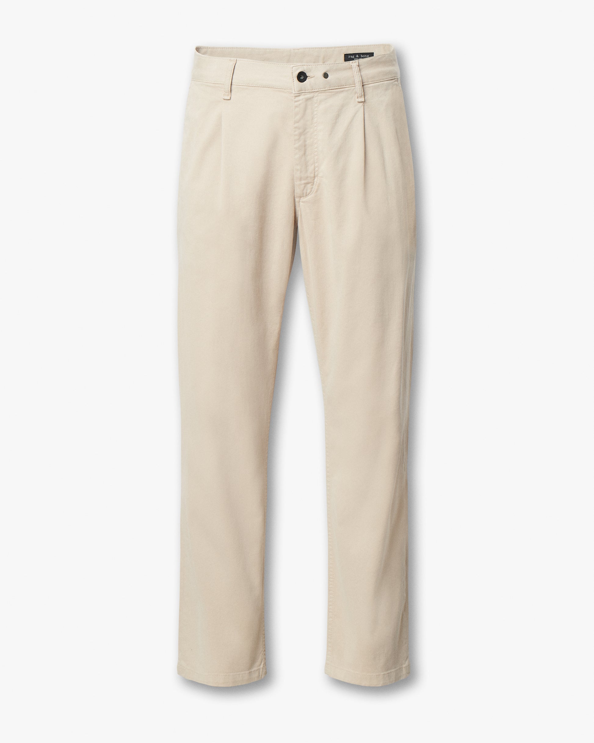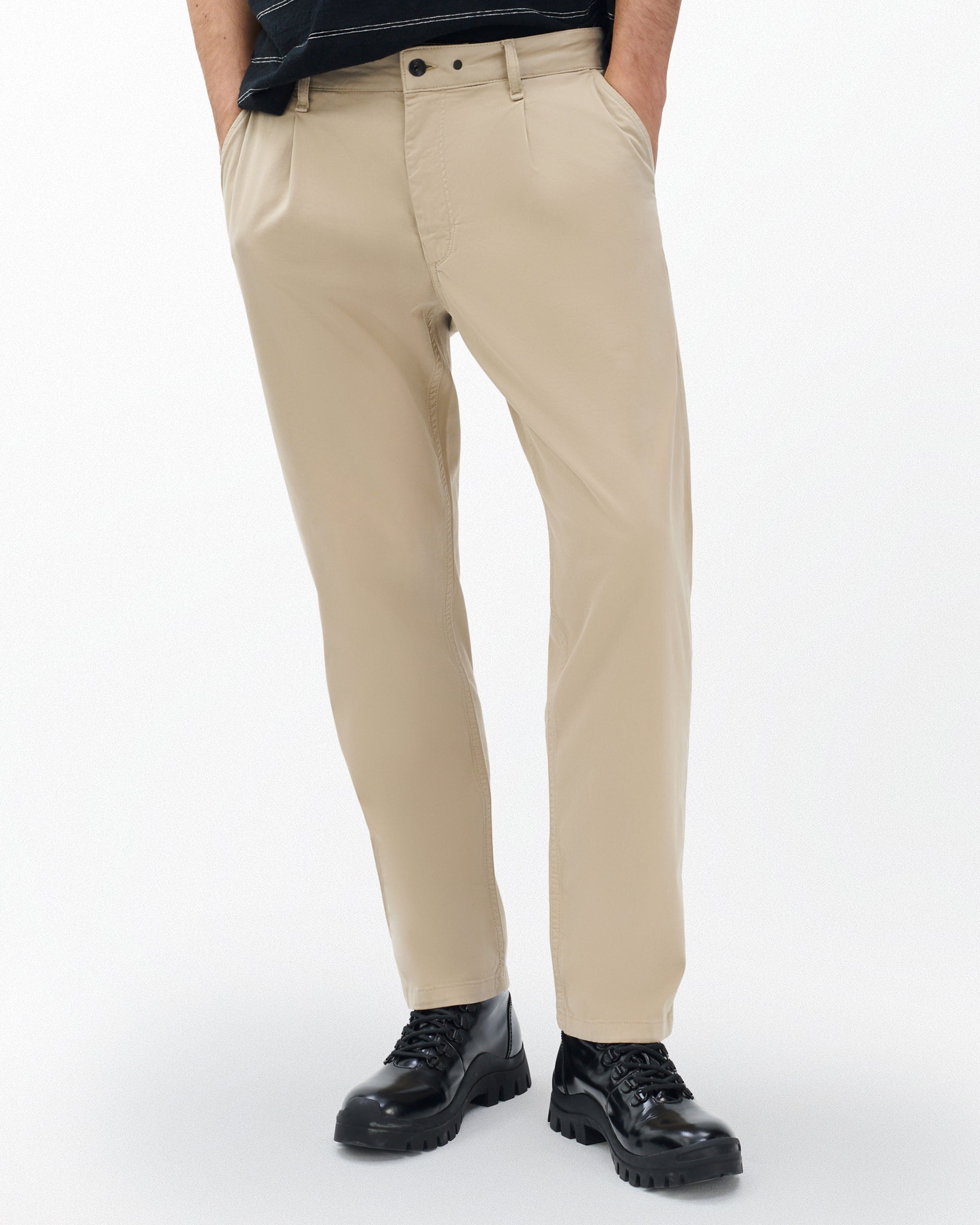 クラシックなチノパンツはプリーツがあることで腰回りにゆとりができ、動きやすさとドレッシーな印象を両立。カジュアルなジャケットと合わせたスタイルがおすすめです。