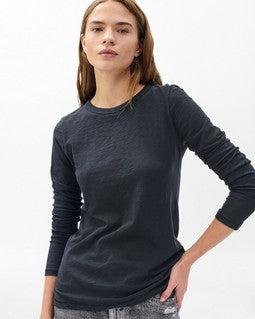柔らかな質感の肌触りが心地良いスリムフィットの定番のクルーネックロングスリーブTEE。