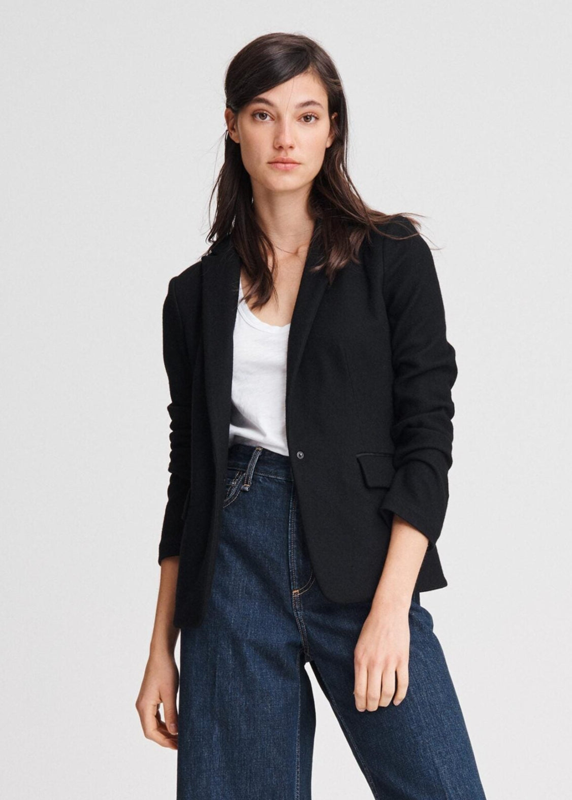 肩やサイドに縫い合わせにグログランリボンのディテール、フロントボタンは着脱が簡単なスナップ留めで少しカジュアルに羽織れるジャケットです。