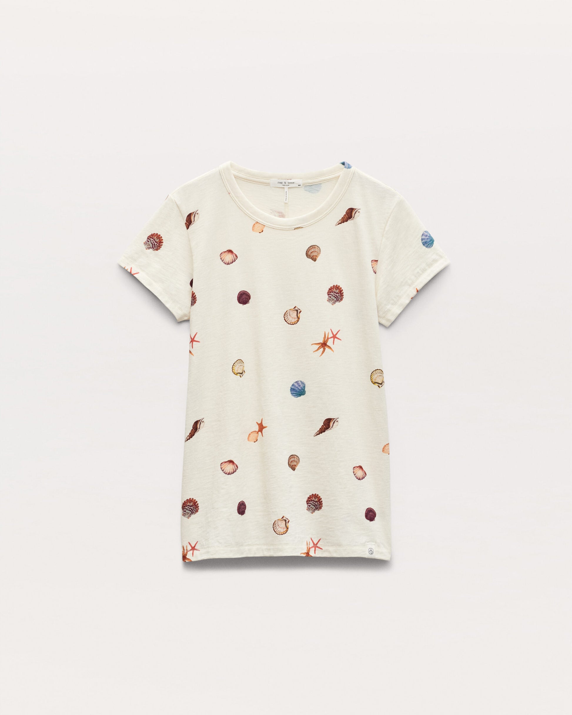 気ままな海岸散歩からインスピレーションを得たクルーネックTシャツ。手書き風のタッチで描かれたカラフルな貝殻柄をデジタルプリントしました。ボディはペルー産スラブコットンを使用しています。