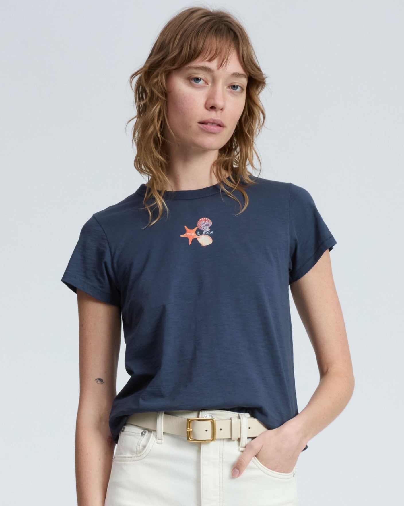 ボディは100%オーガニックコットンを使用。rag & boneの定番のファブリックです。やわらかな肌当たりがやみつきになるTシャツです。胸の中心にプリントが施されたTシャツはブランドとしても数少ないデザインです。